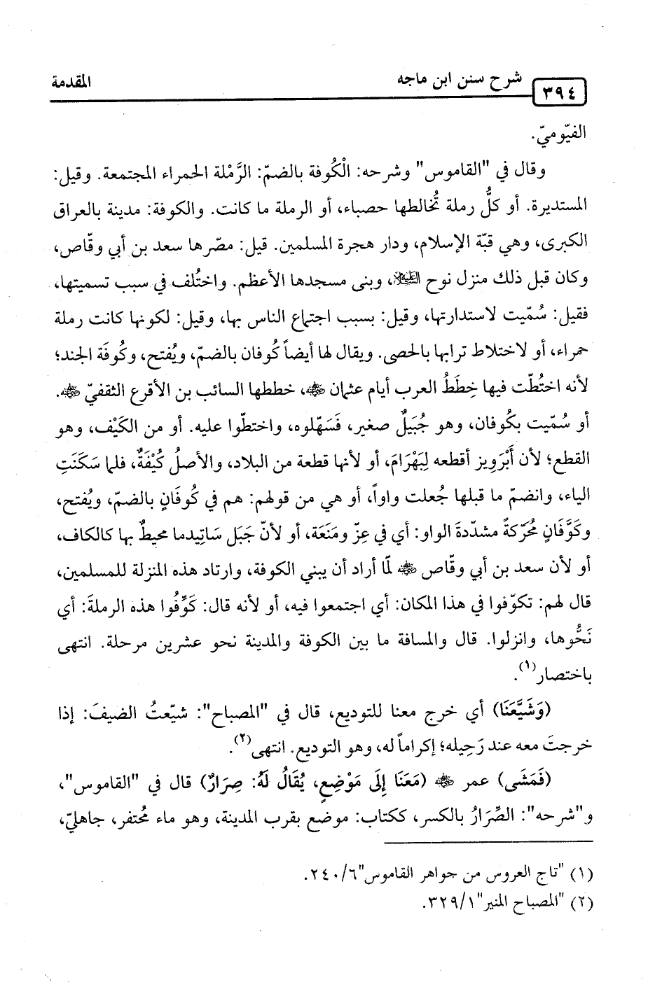 وقال في "القاموس" وشرحه: الْكُوفة بالضمّ: الرَّمْلة الحمراء المجتمعة. وقيل: المستديرة. أو كلُّ رملة تُخالطها حصباء، أو الرملة ما كانت. والكوفة: مدينة بالعراق الكبرى، وهي قبّة الإسلام، ودار هجرة المسلمين. قيل: مصّرها سعد بن أبي وقّاص، وكان قبل ذلك منزل نوح عليه السلام، وبنى مسجدها الأعظم. واختُلف في سبب تسميتها، فقيل: سُمّيت لاستدارتها، وقيل: بسبب اجتماع الناس بها، وقيل: لكونها كانت رملة حمراء، أو لاختلاط ترابها بالحصى. ويقال لها أيضًا كُوفان بالضمّ، ويُفتح، وكُوفَة الجند؛ لأنه اختُطّت فيها خِطَطُ العرب أيام عثمان -رضي الله عنه-، خططها السائب بن الأقرع الثقفيّ -رضي الله عنه-. أو سُمّيت بكُوفان، وهو جُبَيلٌ صغير، فَسَهّلوه، واختطّوا عليه. أو من الكَيْف، وهو القطع؛ لأن أَبْرَوِيز أقطعه لِبَهْرَامَ، أو لأنها قطعة من البلاد، والأصلُ كُيفَةٌ، فلما سَكَنَتِ الياء، وانضمّ ما قبلها جُعلت واوًا، أو هي من قولهم: هم في كُوفَانٍ بالضمّ، ويُفتح، وكَوَّفَانٍ مُحرّكةً ممشدّدةَ الواو: أي في عِزّ ومَنَعَة، أو لأن جَبَل سَاتِيدما محيطٌ بها كالكاف، أو لأن سعد بن أبي وقّاص -رضي الله عنه- لمّا أراد أن يبني الكوفة، وارتاد هذه المنزلة للمسلمين، قال لهم: تكوّفوا في هذا المكان: "أي اجتمعوا فيه، أو لأنه قال: كَوِّفُوا هذه الرملةَ: أي نَحُّوها، وانزلوا. قال والمسافة ما بين الكوفة والمدينة نحو عشرين مرحلة. انتهى باختصار (¬1).