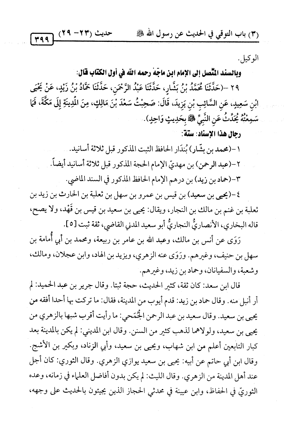 29 - (حَدَّثَنَا مُحَمَّدُ بْنُ بَشَّارٍ، حَدَّثَنَا عَبْدُ الرَّحْمَنِ، حَدَّثَنَا حَمَّادُ بْنُ زَيْدٍ، عَنْ يَحْيَى ابْنِ سَعِيدٍ، عَنِ السَّائِبِ بْنِ يَزِيدَ، قَالَ: صَحِبْتُ سَعْدَ بْنَ مَالِكٍ، مِنَ المَدِينَةِ إِلَى مَكَّةَ، فَمَا سَمِعْتُهُ يُحَدِّثُ عَنِ النَّبِيِّ -صلى الله عليه وسلم- بِحَدِيثٍ وَاحِدٍ).