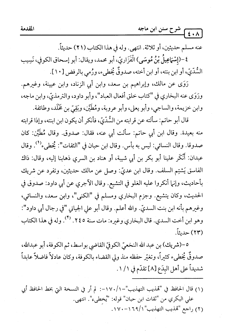 5 - (شريك) بن عبد الله النخعي الكوفيّ القاضي بواسط، ثم الكوفة، أبو عبد الله، صدوقٌ يُخطىء كثيرًا، وتغيّر حفظه منذ ولي القضاء بالكوفة، وكان عادلًا فاضلًا عابدًا شديدًا على أهل البِدَع [8] تقدّم في 1/ 1.