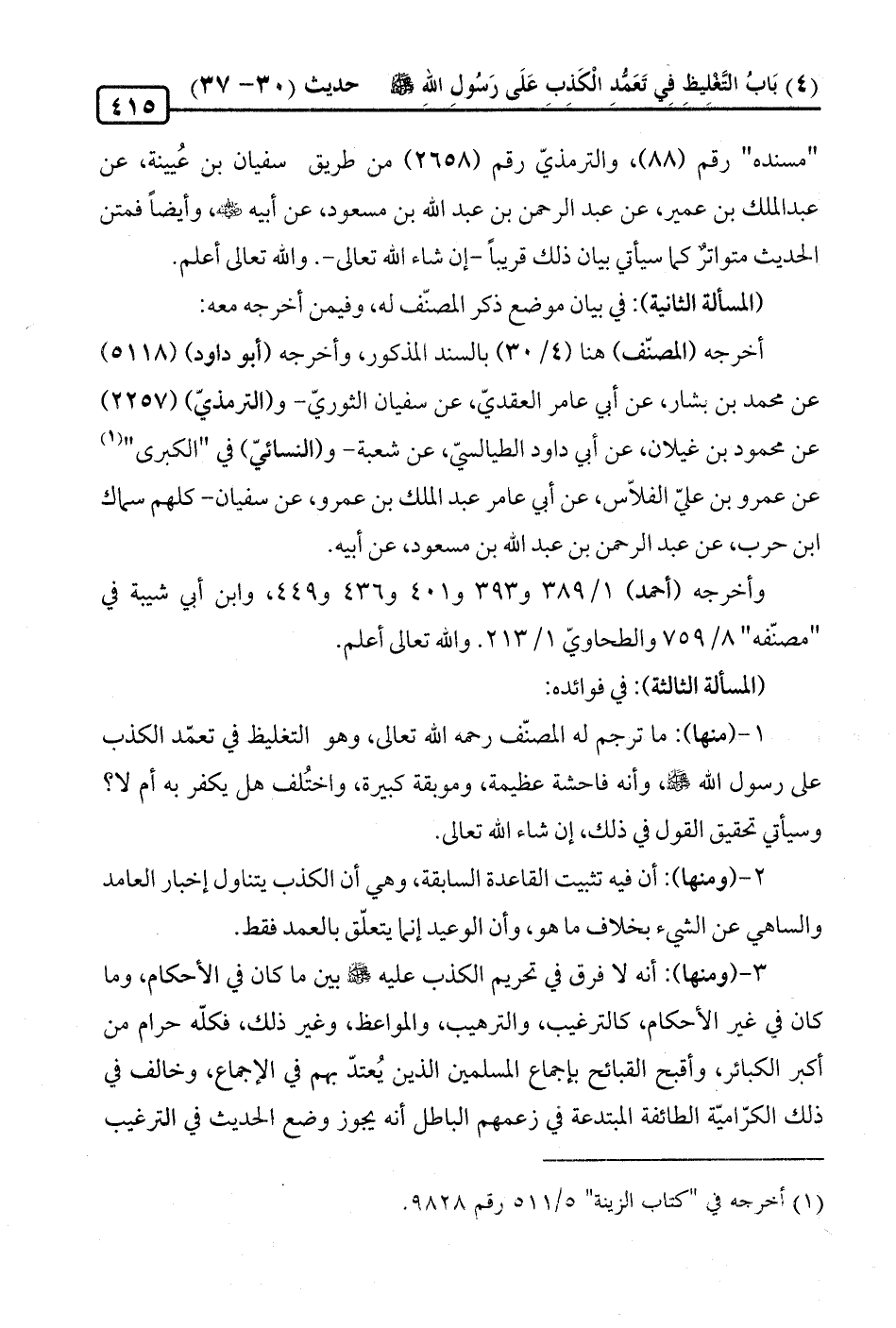 1 - (منها): ما ترجم له المصنّف رحمه الله تعالى، وهو التغليظ في تعمّد الكذب على رسول الله -صلى الله عليه وسلم-، وأنه فاحشة عظيمة، وموبقة كبيرة، واختُلف هل يكفر به أم لا؟