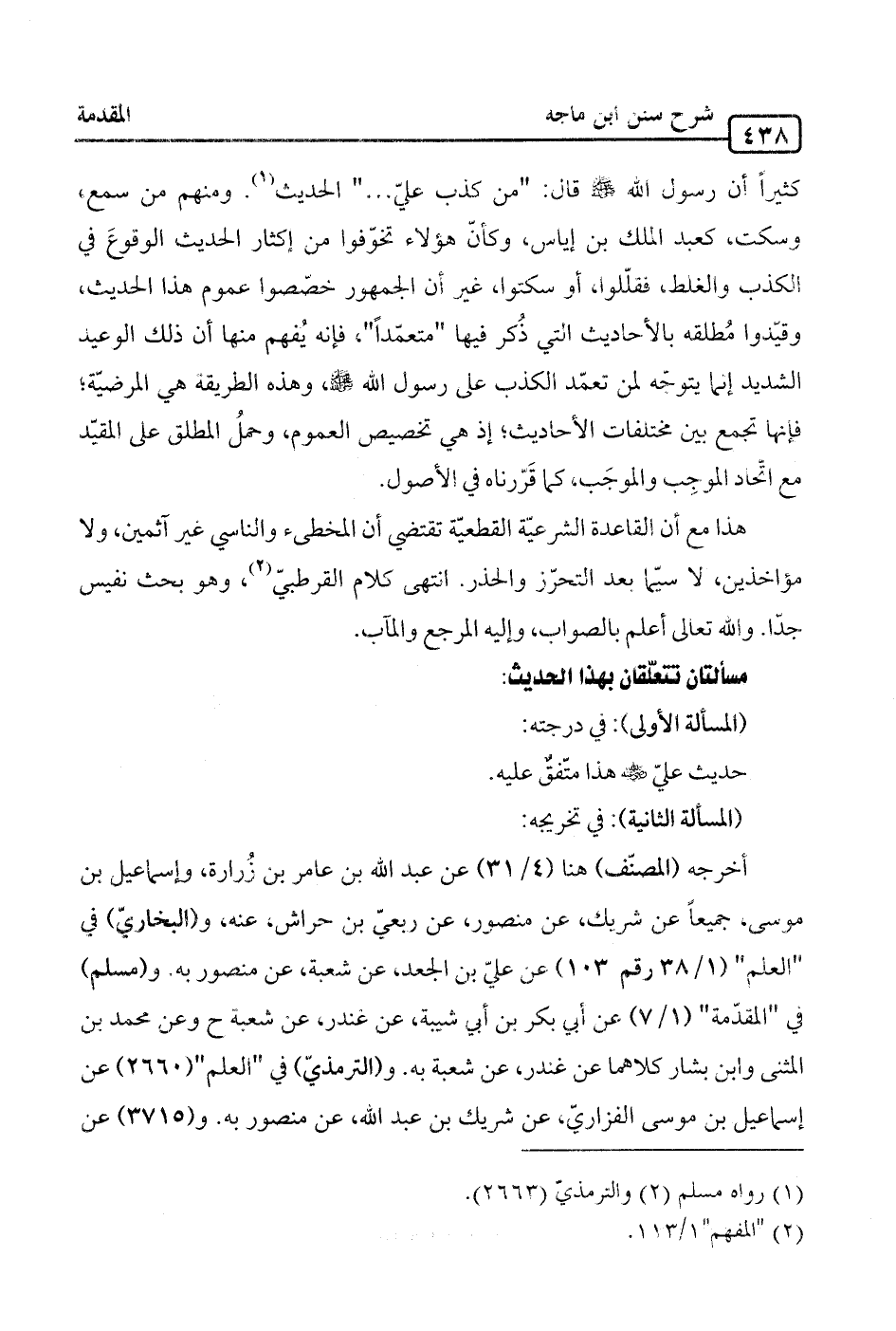 أخرجه (المصنّف) هنا (4/ 31) عن عبد الله بن عامر بن زُرارة، وإسماعيل بن موسى، جميعًا عن شريك، عن منصور، عن ربعيّ بن حراش، عنه، و (البخاريّ) في (العلم) (1/ 38 رقم 103) عن عليّ بن الجعد، عن شعبة، عن منصور به. و (مسلم) في "المقدمة" (1/ 7) عن أبي بكر بن أبي شيبة، عن غندر، عن شعبة ح وعن محمد بن المثنى وابن بشار كلاهما عن غندر، عن شعبة به. و (الترمذيّ) في "العلم" (2660) عن إسماعيل بن موسى الفزاريّ، عن شريك بن عبد الله، عن منصور به. و (3715) عن