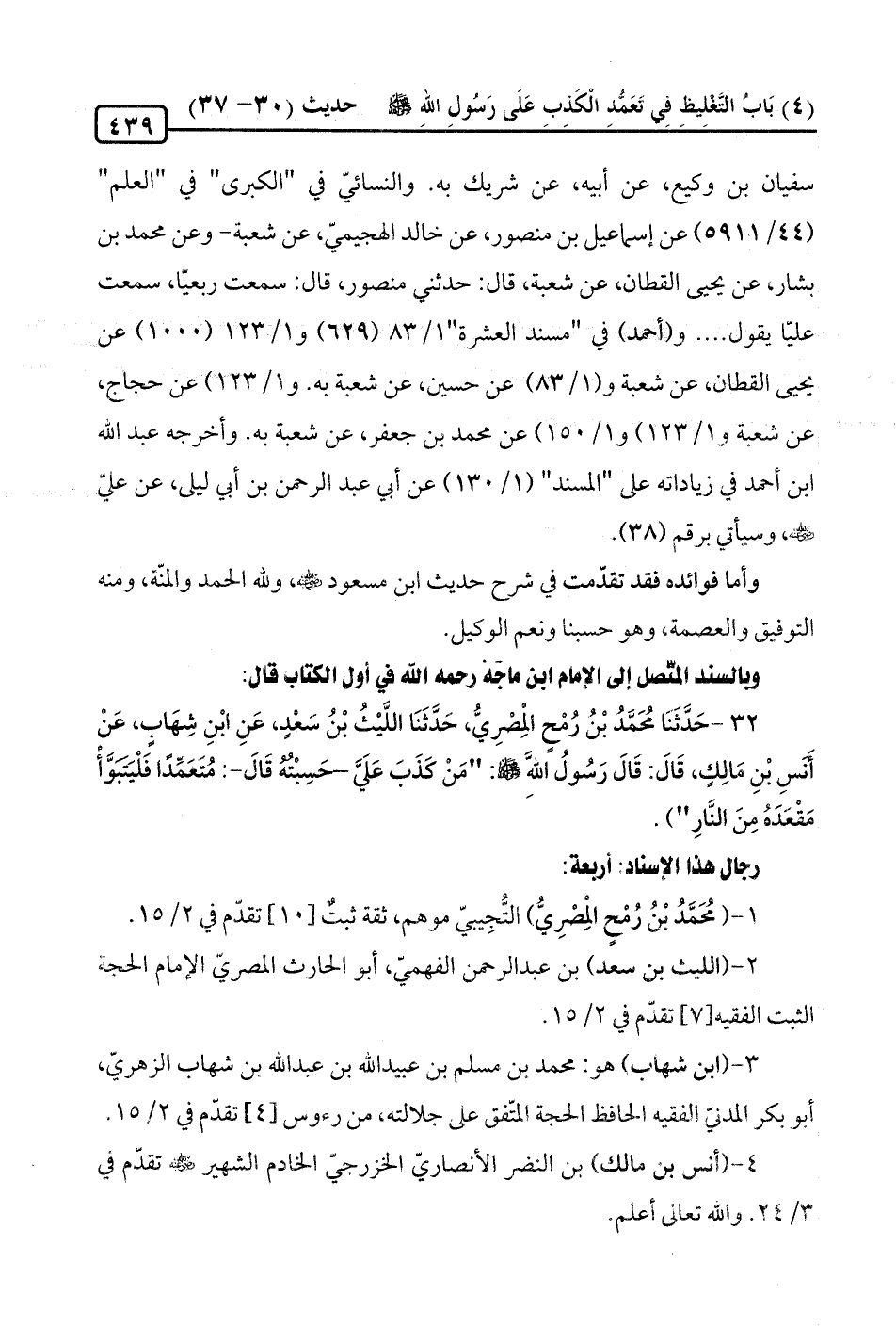 32 - حَدَّثَنَا مُحَمَّدُ بْنُ رُمْحٍ المِصْرِيُّ، حَدَّثَنَا اللَّيْثُ بْنُ سَعْدٍ، عن ابْنِ شِهَابٍ، عَنْ أَنسِ بْنِ مَالِكٍ، قَالَ: قَالَ رَسُولُ الله -صلى الله عليه وسلم-: "مَن كَذَبَ عَلَيَّ -حَسِبْتُهُ قَالَ-: مُتَعَمِّدًا فَلْيَتبَوَّأْ مَقعَدَهُ مِنَ النَّارِ").