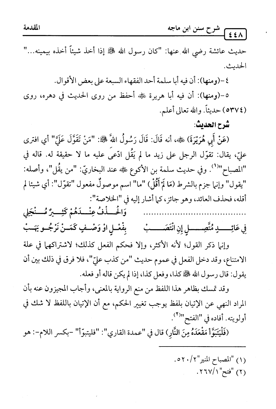 (عَنْ أَبِي هُرَيْرَةَ) -رضي الله عنه-، أنه قَالَ: قَالَ رَسُولُ الله -صلى الله عليه وسلم-: "مَنْ تَقَوَّلَ عَلَيَّ" أي افترى عليّ، يقال: تقوّل الرجل على زيد ما لم يَقُل ادّعىَ عليه ما لا حقيقة له. قاله في "المصباح" (¬1). وفي حديث سلمة بن الأكوع -رضي الله عنه- عند البخاريّ: "من يقُل"، وأصله: "يقول" وإنما جزم بالشرط (مَا لَمْ أَقُلْ) "ما" اسم موصولٌ مفعول "تقوّل": أي شيئا لم أقله، فحذف العائد، وهو جائز، كما أشار إليه في "الخلاصة":