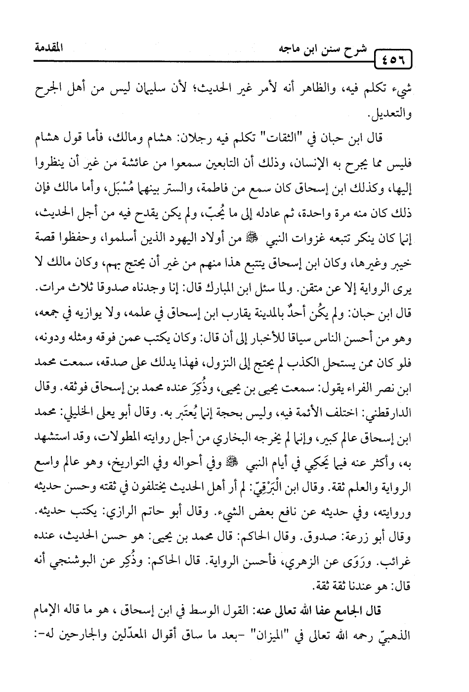قال ابن حبان في "الثقات" تكلم فيه رجلان: هشام ومالك، فأما قول هشام فليس مما يجرح به الإنسان، وذلك أن التابعين سمعوا من عائشة من غير أن ينظروا إليها، وكذلك ابن إسحاق كان سمع من فاطمة، والستر بينهما مُسْبَل، وأما مالك فإن ذلك كان منه مرة واحدة، ثم عادله إلى ما يُحبّ، ولم يكن يقدح فيه من أجل الحديث، إنما كان ينكر تتبعه غزوات النبي -صلى الله عليه وسلم- من أولاد اليهود الذين أسلموا، وحفظوا قصة خيبر وغيرها، وكان ابن إسحاق يتتبع هذا منهم من غير أن يحتج بهم، وكان مالك لا يرى الرواية إلا عن متقن. ولما سئل ابن المبارك قال: إنا وجدناه صدوقا ثلاث مرات. قال ابن حبان: ولم يكُن أحدٌ بالمدينة يقارب ابن إسحاق في علمه، ولا يوازيه في جمعه، وهو من أحسن الناس سياقا للأخبار إلى أن قال: وكان يكتب عمن فوقه ومثله ودونه، فلو كان ممن يستحل الكذب لم يحتج إلى النزول، فهذا يدلك على صدقه، سمعت محمد ابن نصر الفراء يقول: سمعت يحيى بن يحيى، وذُكِرَ عنده محمد بن إسحاق فوثقه. وقال الدارقطني: اختلف الأئمة فيه، وليس بحجة إنما يُعتَبر به. وقال أبو يعلى الخليلي: محمد ابن إسحاق عالم كبير، وإنما لم يخرجه البخاري من أجل روايته المطولات، وقد استشهد به، وأكثر عنه فيما يَحكِي في أيام النبي -صلى الله عليه وسلم- وفي أحواله وفي التواريخ، وهو عالم واسع الرواية والعلم ثقة. وقال ابن الْبَرْقِيّ: لم أر أهل الحديث يختلفون في ثقته وحسن حديثه وروايته، وفي حديثه عن نافع بعض الشيء. وقال أبو حاتم الرازي: يكتب حديثه. وقال أبو زرعة: صدوق. وقال الحاكم: قال محمد بن يحيى: هو حسن الحديث، عنده غرائب. ورَوَى عن الزهري، فأحسن الرواية. قال الحاكم: وذُكِر عن البوشنجي أنه قال: هو عندنا ثقة ثقة.