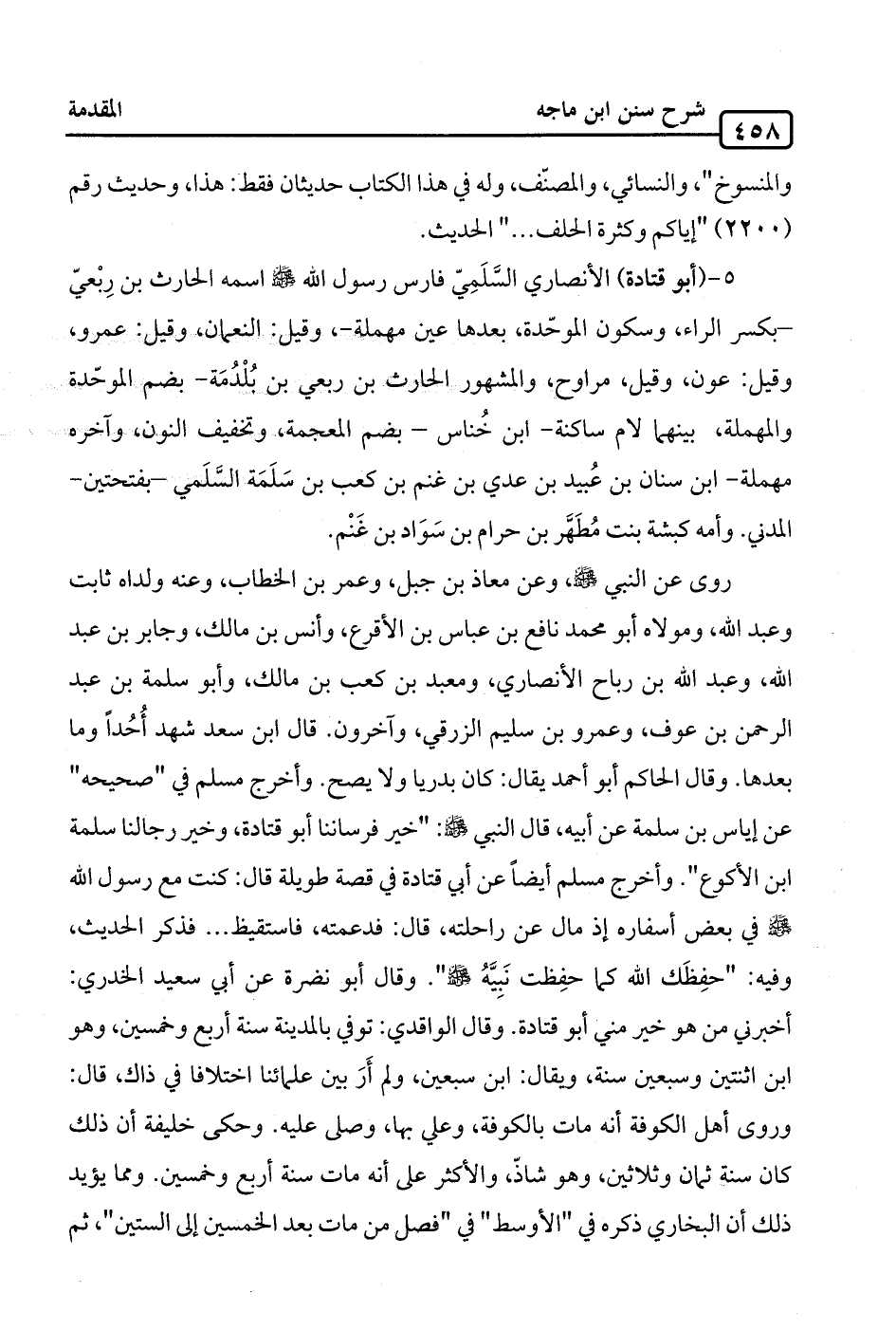5 - (أبو قتادة) الأنصاري السَّلَمِيّ فارس رسول الله -صلى الله عليه وسلم- اسمه الحارث بن رِبْعيّ -بكسر الراء، وسكون الموحّدة، بعدها عين مهملة-، وقيل: النعمان، وقيل: عمرو، وقيل: عون، وقيل، مراوح، والمشهور الحارث بن ربعي بن بُلْدُمَة -بضم الموحّدة والمهملة، بينهما لام ساكنة-ابن خُناس -بضم المعجمة، وتخفيف النون، وآخره مهملة- ابن سنان بن عُبيد بن عدي بن غنم بن كعب بن سَلَمَة السَّلَمي -بفتحتين- المدني. وأمه كبشة بنت مُطَهَّر بن حرام بن سَوَاد بن غَنْم.