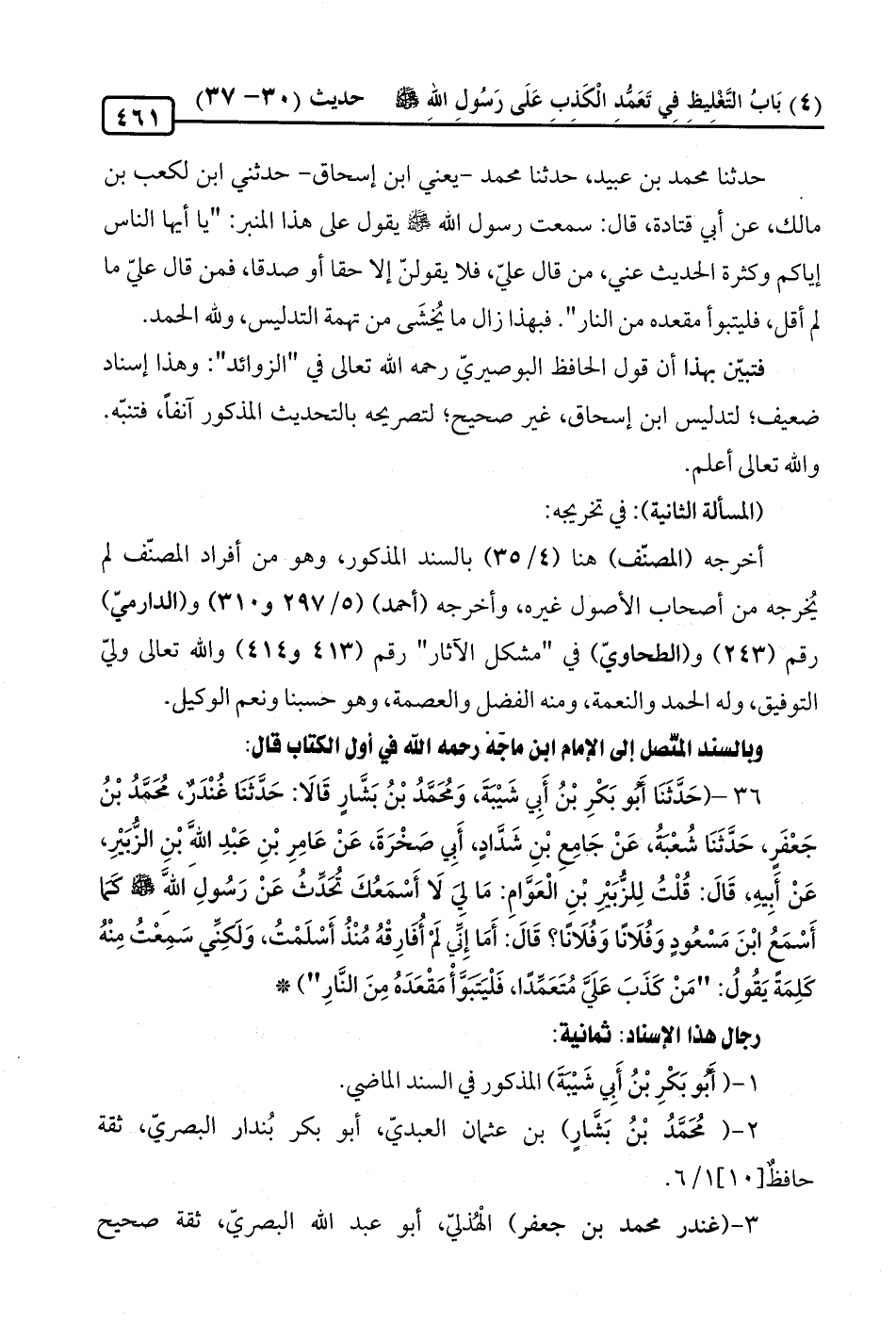 36 - (حَدَّثَنَا أَبُو بَكْرِ بْنُ أَبِي شَيْبَةَ، وَمُحَمَّدُ بْنُ بَشَّارٍ قَالَا: حَدَّثَنَا غُنْدَرٌ، مُحَمَّد بْنُ جَعْفَرٍ، حَدَّثَنَا شُعْبَةُ، عَنْ جَامِعِ بْنِ شَدَّادٍ، أَبِي صَخْرَةَ، عَنْ عَامِرِ بْنِ عَبْدِ اللَّهَ بْنِ الزُّبَيْرِ، عَنْ أَبِيهِ، قَالَ: قُلْتُ لِلزُّبَيْرِ بْنِ الْعَوَّامِ: مَا ليَ لَا أَسْمَعُكَ تُحَدِّثُ عَنْ رَسُولِ اللَّه -صلى الله عليه وسلم- كَمَا أَسْمَعُ ابْنَ مَسْعُودٍ وَفُلَانًا وَفُلَانًا؟ قَالَ: أَمَا إِنِّي لَمْ أُفَارِقْهُ مُنْذُ أَسْلَمْتُ، وَلَكِنِّي سَمِعْتُ مِنْهُ كَلِمَةً يَقُولُ: "مَنْ كَذَبَ عَلَيَّ مُتَعَمِّدًا، فَلْيَتبَؤَأْ مَقْعَدَهُ مِنَ النَّارِ")