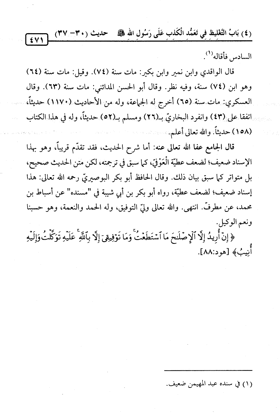 قال الجامع عفا الله تعالى عنه: أما شرح الحديث، فقد تقدّم قريبًا، وهو بهذا الإسناد ضعيف؛ لضعف عطيّة الْعَوْفيّ، كما سبق في ترجمته، لكن متن الحديث صحيح، بل متواتر كما سبق بيان ذلك. وقال الحافظ أبو بكر البوصيريّ رحمه الله تعالى: هذا إسناد ضعيف؛ لضعف عطيّة، رواه أبو بكر بن أبي شيبة في "مسنده" عن أسباط بن محمد، عن مطرف. انتهى. والله تعالى وليّ التوفيق، وله الحمد والنعمة، وهو حسبنا ونعم الوكيل.