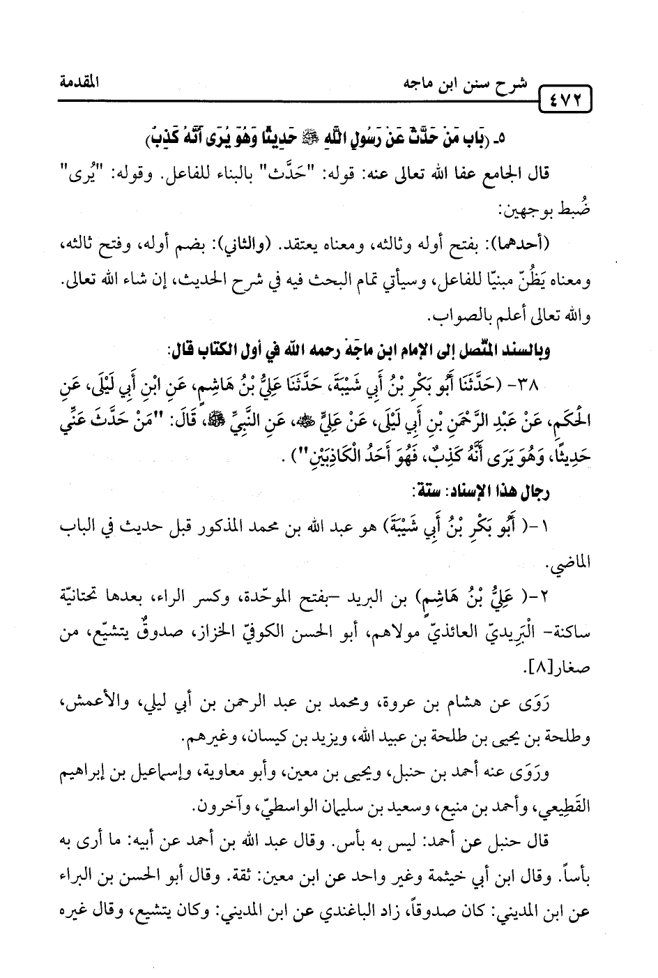 38 - (حَدَّثَنَا أَبُو بَكْرِ بْنُ أَبِي شَيْبَةَ، حَدَّثَنَا عِلِيُّ بْنُ هَاشِمٍ، عَنِ ابْنِ أَبِي لَيْلَى، عَنِ الْحَكَمِ، عَنْ عَبْدِ الرَّحْمَنِ بْنِ أَبِي لَيْلَى، عَنْ عَلي -رضي الله عنه-، عَنِ النَّبِيِّ -صلى الله عليه وسلم-، قَالَ: "مَنْ حَدَّثَ عَنِّي حَدِيثًا، وَهُوَ يَرَى أنَّهُ كَذِبٌ، فَهُوَ أَحَدُ الْكَاذِبَيْنِ").