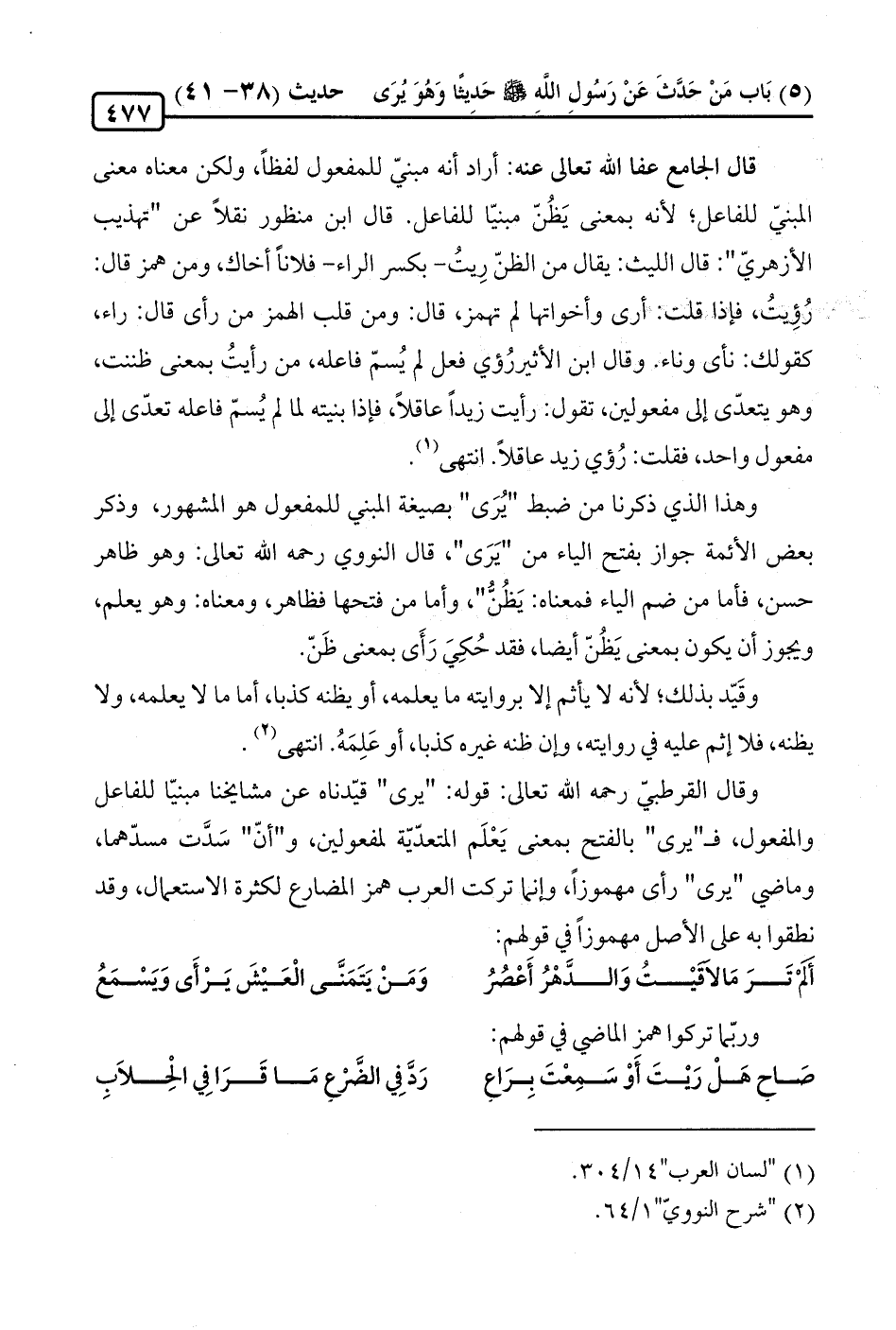 قال الجامع عفا الله تعالى عنه: أراد أنه مبنيّ للمفعول لفظًا، ولكن معناه معنى المبنيّ للفاعل؛ لأنه بمعنى يَظُنّ مبنيّا للفاعل. قال ابن منظور نقلًا عن "تهذيب الأزهريّ": قال الليث: يقال من الظنّ رِيتُ -بكسر الراء- فلانًا أخاك، ومن همز قال: رُؤِيتُ، فإذا قلت: أرى وأخواتها لم تهمز، قال: ومن قلب الهمز من رأى قال: راء، كقولك: نأى وناء. وقال ابن الأثير رُؤي فعل لم يُسمّ فاعله، من رأيتُ بمعنى ظننت، وهو يتعدّى إلى مفعولين، تقول: رأيت زيدًا عاقلًا، فإذا بنيته لما لم يُسمّ فاعله تعدّى إلى مفعول واحد، فقلت: رُؤي زيد عاقلًا. انتهى (¬1).