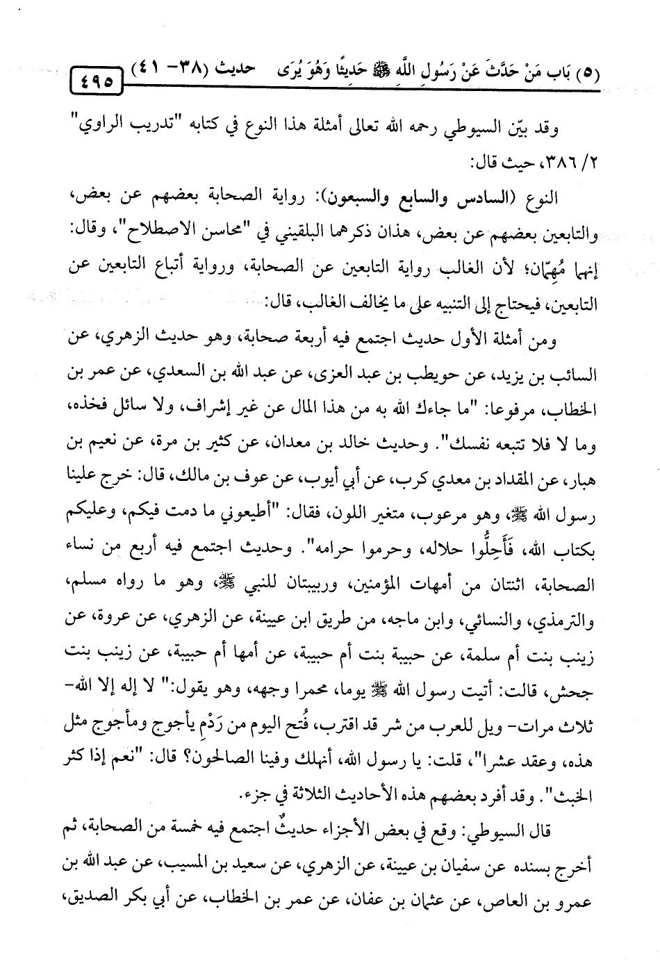 قال السيوطي: وقع في بعض الأجزاء حديثٌ اجتمع فيه خمسة من الصحابة، ثم أخرج بسنده عن سفيان بن عيينة، عن الزهري، عن سعيد بن المسيب، عن عبد الله بن عمرو بن العاص، عن عثمان بن عفان، عن عمر بن الخطاب، عن أبي بكر الصديق،