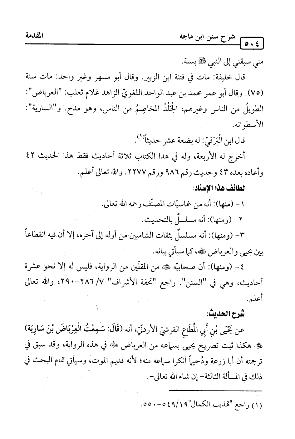 عن يَحْيى بْنِ أَبِي المُطَاعِ القرشيّ الأردنّيّ، أنه (قَالَ: سَمِعْتُ الْعِرْبَاضَ بْنَ سَارِيَة) -رضي الله عنه- هكذا ثبت تصريح يحيى بسماعه من العرباض -رضي الله عنه- في هذه الرواية، وقد سبق في ترجمته أن أبا زرعة ودُحيمًا أنكرا سماعه منه، لأنه قديم الموت، وسيأتي تمام البحث في ذلك في المسألة الثالثة -إن شاء الله تعالى-.