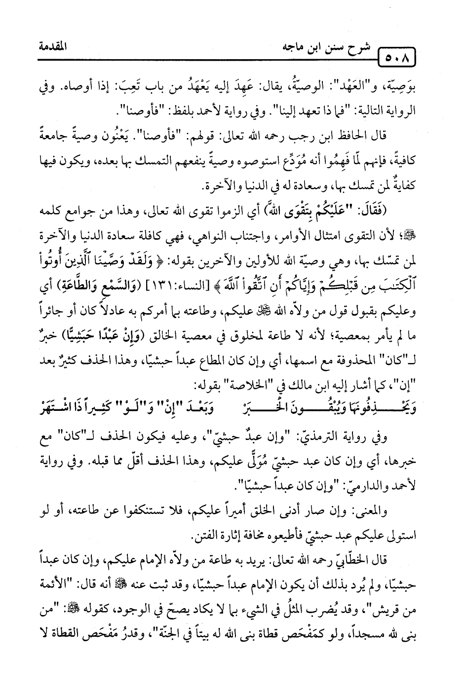 وعليكم بقبول قول من ولّاه الله عز وجل عليكم، وطاعته بما أمركم به عادلًا كان أو جائرًا ما لم يأمر بمعصية؛ لأنه لا طاعة لمخلوق في معصية الخالق (وَإِنْ عَبْدًا حَبَشِيًّا) خبرٌ لـ "كان" المحذوفة مع اسمها، أي وإن كان المطاع عبدًا حبشيًّا، وهذا الحذف كثيرٌ بعد "إن"، كما أشار إليه ابن مالك في "الخلاصة" بقوله: