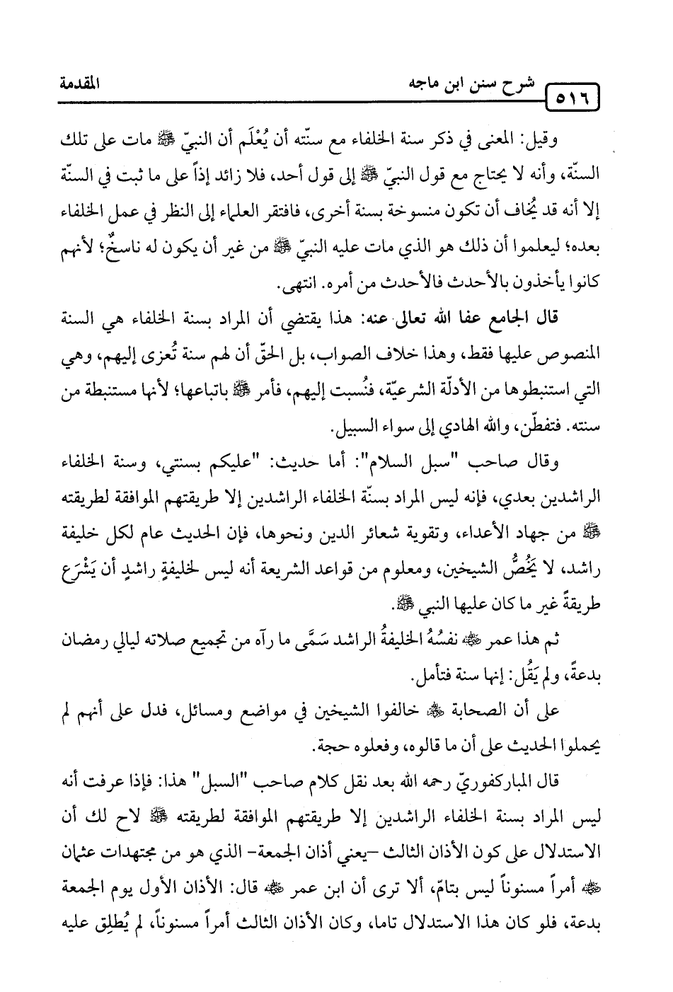 وقال صاحب "سبل السلام": أما حديث: "عليكم بسنتي، وسنة الخلفاء الراشدين بعدي، فإنه ليس المراد بسنّة الخلفاء الراشدين إلا طريقتهم الموافقة لطريقته -صلى الله عليه وسلم- من جهاد الأعداء، وتقوية شعائر الدين ونحوها، فإن الحديث عام لكل خليفة راشد، لا يَخُصُّ الشيخين، ومعلوم من قواعد الشريعة أنه ليس لخليفةٍ راشدٍ أن يَشْرَع طريقةً غير ما كان عليها النبي -صلى الله عليه وسلم-.