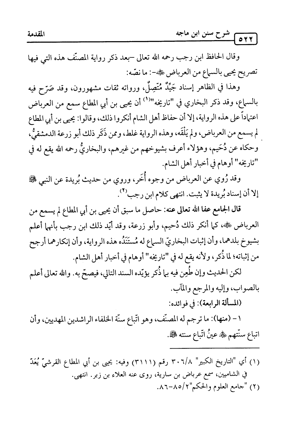 وقال الحافظ ابن رجب رحمه الله تعالى-بعد ذكر رواية المصنّف هذه التي فيها تصريح يحيى بالسماع من العرباض -رضي الله عنه-: ما نصّه: