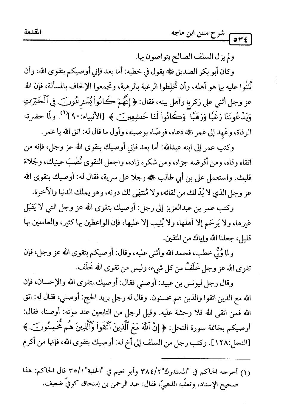 وكان أبو بكر الصديق -رضي الله عنه- يقول في خطبه: أما بعد فإني أوصيكم بتقوى الله، وأن تُثنُوا عليه بما هو أهله، وأن تَخلِطوا الرغبة بالرهبة، وتجمعوا الإلحاف بالمسألة، فإن الله عز وجل أثني على زكريا وأهل بيته، فقال: {إِنَّهُمْ كَانُوا يُسَارِعُونَ في الْخَيْرَاتِ وَيَدْعُونَنَا رَغَبًا وَرَهَبًا وَكَانُوا لَنَا خَاشِعِينَ} [الأنبياء: 90] (¬1). ولمّا حضرته الوفاة، وعَهِد إلى عمر -رضي الله عنه- دعاه، فوصّاه بوصيته، وأول ما قال له: اتق الله يا عمر.