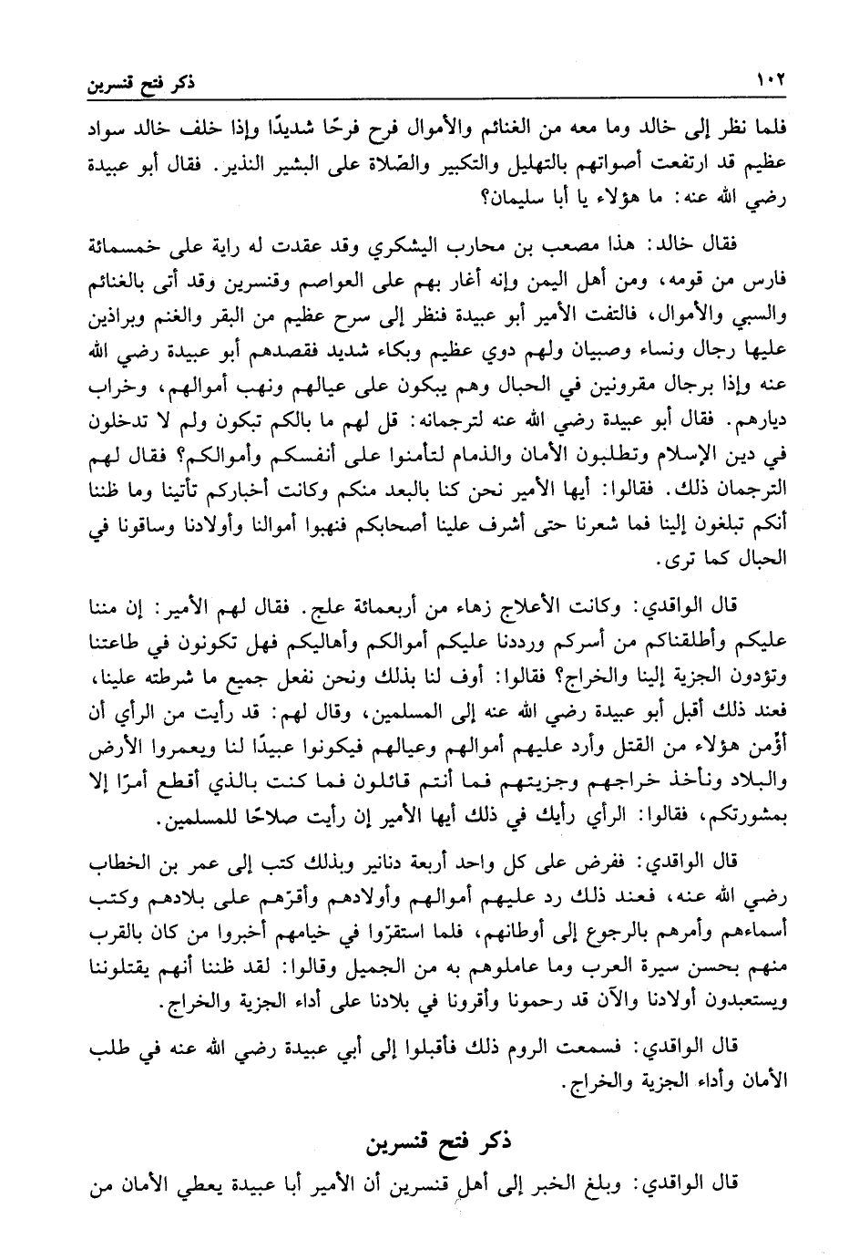 قال الواقدي: وبلغ الخبر إلى أهل قنسرين أن الأمير أبا عبيدة يعطي الأمان من.