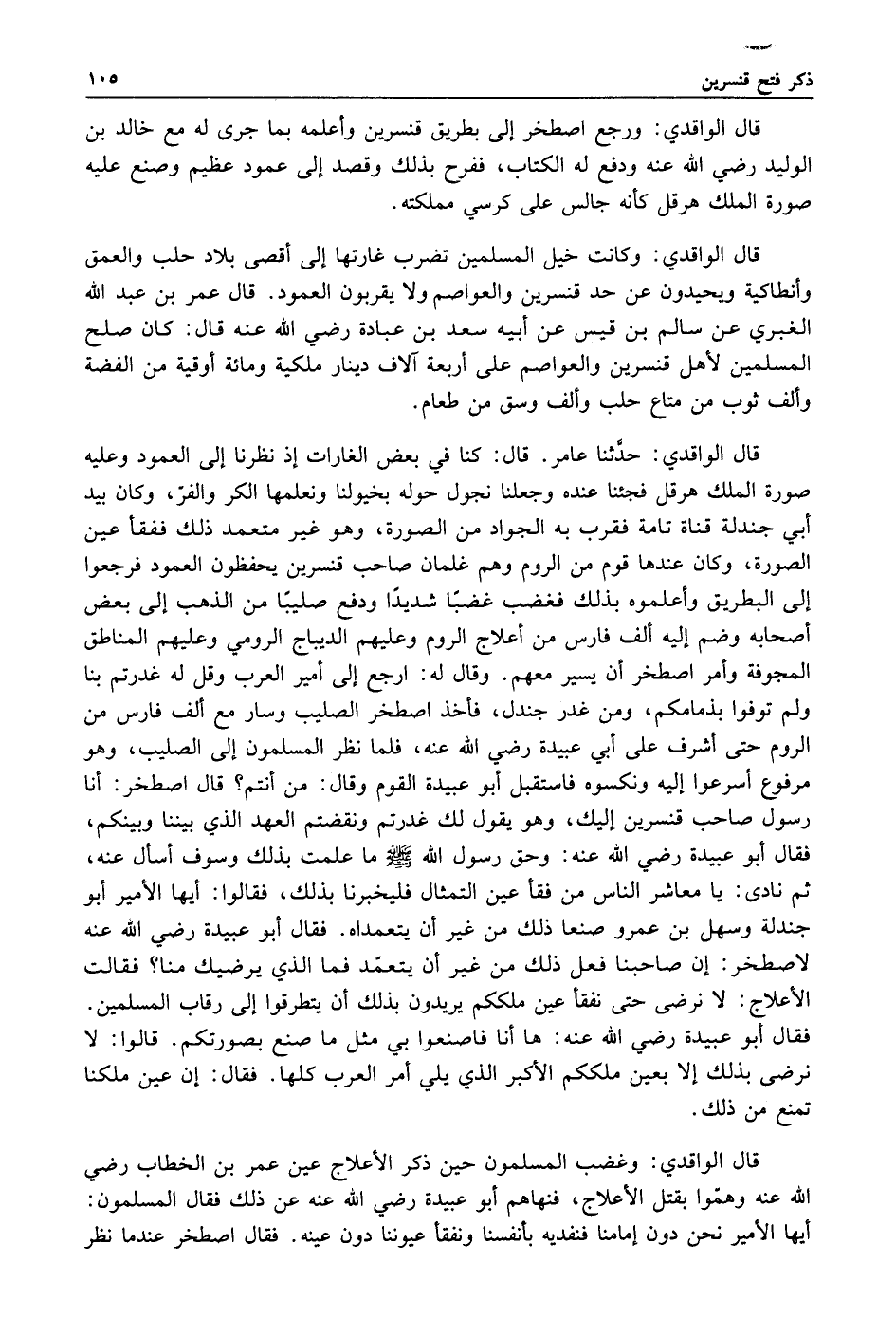قال الواقدي: وكانت خيل المسلمين تضرب غارتها إلى اقصى بلاد حلب والعمق وانطاكية ويحيدون عن حد قنسرين والعواصم إلا يقربون العمود قال عمر بن عبد الله الغبري عن سالم بن قيس عن ابيه سعد بن عبادة رضي الله عنه قال كان صلح المسلمين لاهل قنسرين والعواصم على أربعة آلاف دينار ملكية ومائة اوقية من الفضة والف ثوب من متاع حلب والف وسق من طعام.
