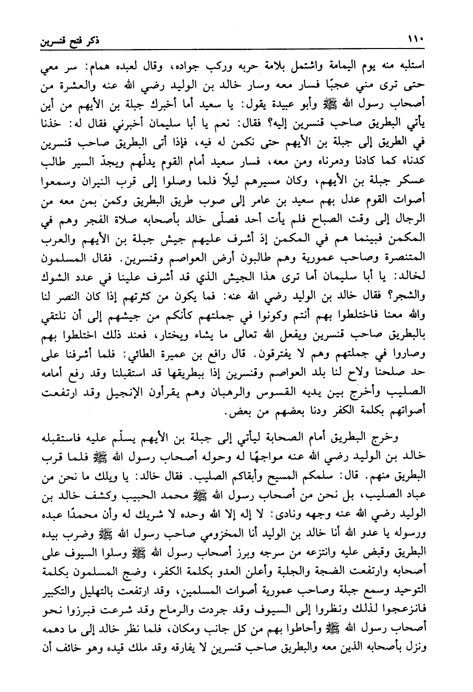 استلبه منه يوم اليمامة واشتمل بلامة حربه وركب جواده وقال لعبده همام سر معي حتى ترى مني عجبا فسار معه وسار خالد بن الوليد رضي الله عنه والعشرة من أصحاب رسول الله صلى الله عليه وسلم وأبو عبيدة يا سعيد أما اخبرك جبلة بن الأيهم من اين يأتي البطريق صاحب قنسرين إليه فقال: نعم يا أبا سليمان اخبرني فقال له: خذنا في الطريق إلى جبلة بن الأيهم رضي الله عنه يدعو لهم بالنصر فأقبل خالد على سعيد بن عامر الأنصاري وقال حتى نكمن له فيه فإذا أتى البطريق صاحب قنسرين كدناه كما كادنا ودمرناه ومن معه فسار سعيد أمام القوم يدلهم ويجد السر طالب عسكر جبلة بن الأيهم وكان مسيرهم ليلا فلما وصلوا إلى قرب النيران وسمعوا اصوات القوم عدل بهم سعيد بن عامر إلى صوب طريق البطريق وكمن بمن معه من الرجال إلى وقت الصباح فلم يأت أحد فصلى خالد بأصحابه صلاة الفجر وهم في المكمن فبينما هم في المكمن إذ اشرف عليهم جيش جبلة بن الأيهم والعرب المتنصرة وصاحب عمورية وهم طالبون ارض العواصم وقنسرين فقال المسلمون لخالد يا أبا سليمان أما ترى هذا الجيش الذي قد اشرف علينا في عدد الشوك والشجر فقال خالد بن الوليد رضي الله عنه: فما يكون من كثرتهم إذا كان النصر لنا والله معنا فاختلطوا بهم انتم وكونوا في جملتهم كأنكم من جيشهم إلى أن نلتقي بالبطريق صاحب قنسرين ويفعل الله تعالى ما يشاء ويختار فعند ذلك اختلطوا بهم وصاروا في جملتهم وهم لا يفترقون قال رافع بن عميرة الطائي فلما اشرفنا على حد صلحنا ولاح لنا بلد العواصم وقنسرين إذا ببطريقها قد استقبلنا وقد رفع امامه الصليب واخرج بين يديه القسوس والرهبان وهم يقرأون الإنجيل وقد ارتفعت اصواتهم بكلمة الكفر ودنا بعضهم من بعض.
