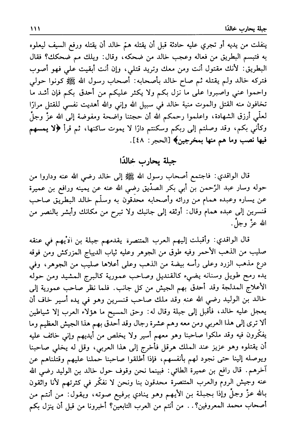 ينفلت من يديه أو تجري عليه حادثة قبل أن يقتله هم خالد أن يقتله ورفع السيف ليعلوه به فتبسم البطريق من فعاله وعجب خالد من ضحكه وقال ويلك مم ضحكك فقال البطريق لانك مقتول أنت ومن معك وتريد قتلي وأن أنت ابقيت علي فهو اصوب فتركه خالد ولم يقتله ثم صاح خالد بأصحابه أصحاب رسول الله صلى الله عليه وسلم كونوا حولي واحموا عني واصبروا على ما نزل بكم ولا يكثر عليكم من أحدق بكم فإن اشد ما تخافون منه القتل والموت منية خالد في سبيل الله وإني والله اهديت نفسي للقتل مرارا لعلي ارزق الشهادة واعلموا رحمكم الله أن حجتنا واضحة ومفوضة إلى الله عز وجل وكأني بكم وقد وصلتم إلى ربكم وسكنتم دارا لا يموت ساكنها ثم قرأ: {لا يَمَسُّهُمْ فِيهَا نَصَبٌ وَمَا هُمْ مِنْهَا بِمُخْرَجِينَ} [الحجر:48] .