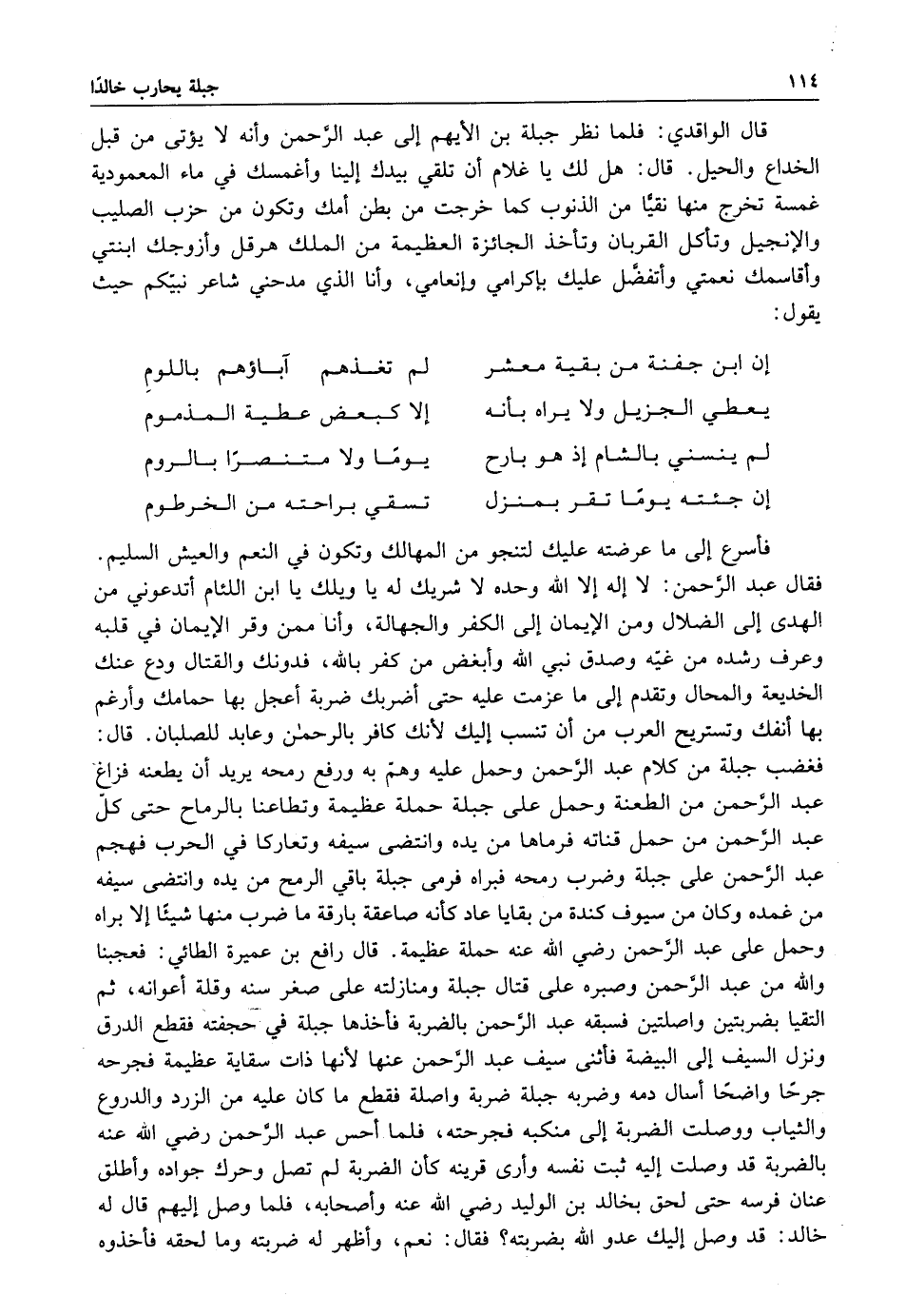 فأسرع إلى ما عرضته عليك لتنجو من المهالك وتكون في النعم والعيش السليم فقال عبد الرحمن لا إله إلا الله وحده لا شريك له يا ويلك يا ابن اللئام أتدعوني من الهدى إلى الضلال ومن الإيمان إلى الكفر والجهالة وأنا ممن وقر الإيمان في قلبه وعرف رشده من غيه وصدق نبي الله وابغض من كفر بالله فدونك والقتال ودع عنك الخديعة والمحال وتقدم إلى ما عزمت عليه حتى أضربك ضربة أعجل بها حمامك وارغم بها انفك وتستريح العرب من أن تنسب إليك لانك كافر بالرحمن وعابد للصلبان قال فغضب ج 4 بلة من كلام عبد الرحمن جعل عليه وهم به ورفع رمحه يريد أن يطعنه فزاع عبدلارحمن من الطعنة وحمل على جبلة حملة عظيمة وتطاعنا بالرماح حتى كل عبد الرحمن من حمل قناته فرماها من يده وانتضى سيفه وتعاركا في الحرب فهجم عبد الرحمن على جبلة وضرب رمحه فبراه فرمى جبلة باقي الرمح من يده وانتضى سيفه من غمده وكان من سيوف كندة من بقايا كأنه صاعقة بارقة ما ضرب به شيءا إلا براه وحمل على عبد الرحمن رضي الله عنه حملة عظيمة قال رافع بن عميرة الطائي: فعجبنا والله من عبد الرحمن وصبره على قتال جبلة ومنازلته على صغر سنه وقلة أعوانه ثم التقيا بضربتين واصلتين فسبقه عبد الرحمن بالضربة فأخذها جبلة من حجفته فقطع الدرق ونزل السيف إلى البيضة فاثنى سيف عبد الرحمن عنها لأنها ذات سقاية عظيمة فجرحه جرحا واضحا اسأل دمه وضربه جبلة ضربة واصلة فقطع ما كان عليه من الزرد والدروع والثياب ووصلت الضربة إلى منكبه فجرحته فلما أحسن عبد الرحمن رضي الله عنه بالضربة قد وصلت إليه ثبت نفسه وارى قرينه كأن الضربة لم تصل وحرك جواده واطلق عنان فرسه حتى لحق بخالد بن الوليد رضي الله عنه وأصحابه فلما وصل إليهم قال له خالد: قد وصل إليك عدو الله بضربته فقال: نعم وأظهر له ضربته وما لحقه فأخذوه.