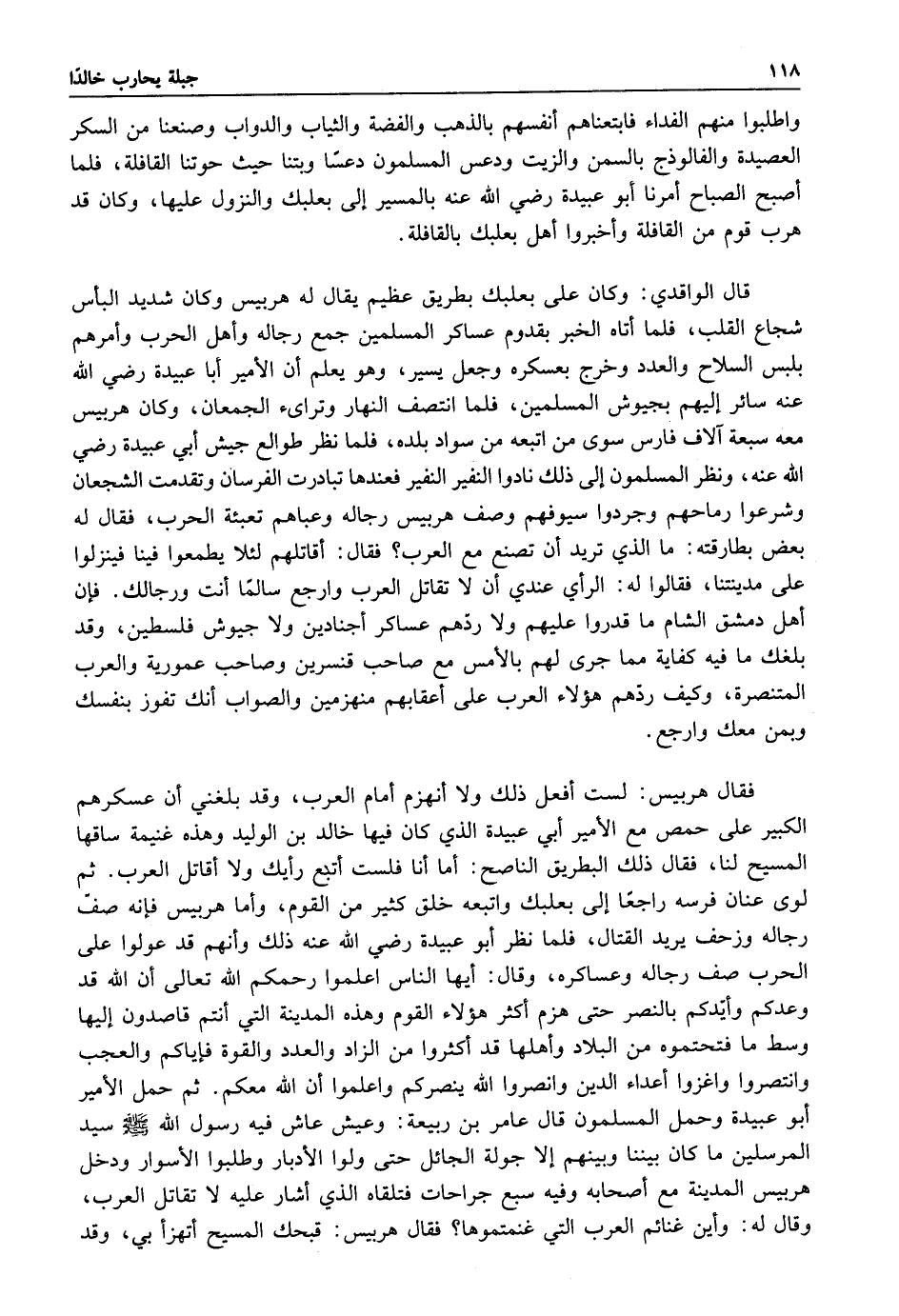 فقال هربيس لست أفعل ذلك ولا أنهزم أمام العرب وقد بلغني أن عسكرهم الكبير على حمص مع الأمير ابي عبيدة الذي كان فيها خالد بن الوليد وهذه غنيمة ساقها المسيح لنا فقال ذلك البطريق الناصح أما أنا فلست أبتع رأيك ولا أقاتل العرب ثم لوى عنان فرسه راجعا إلى بعلبك واتبعه خلق كثير من القوم واما هربيس فإنه صف رجاله وزحف يريد القتال فلما نظر أبو عبيدة رضي الله عنه ذلك وإنهم قد عولوا على الحرب صف رجاله وعساكره وقال: أيها الناس اعلموا رحمكم الله تعالى أن الله قد وعدكم وأيدكم بالنصر حتى هزم أكثر هؤلاء القوم وهذه المدينة التي أنتم قاصدون إليها وسط ما فتحتموه من البلاد وأهلها قد أكثروا من الزاد والعدد والقوة فإياكم والعجب وانتصروا وأغزوا أعداء الدين وانصروا الله ينصركم وأعلموا أن الله معكم ثم حمل الأمير أبو عبيدة وحمل المسلمون قال عامر بن ربيعة وعيش عاش فيه رسول الله صلى الله عليه وسلم سيد المرسلين ما كان بيننا وبينهم إلا جولة الجائل حتى ولوا الأدبار وطلبوا الاسوار ودخل هربيس المدينة مع أصحابه وفيه سبع جراحات فتلقاه الذي أشار عليه لا تقاتل العرب وقال له: وأين غنائم العرب التي غنمتوها فقال هربيس قبحك المسيح أتهزأ بي وقد.