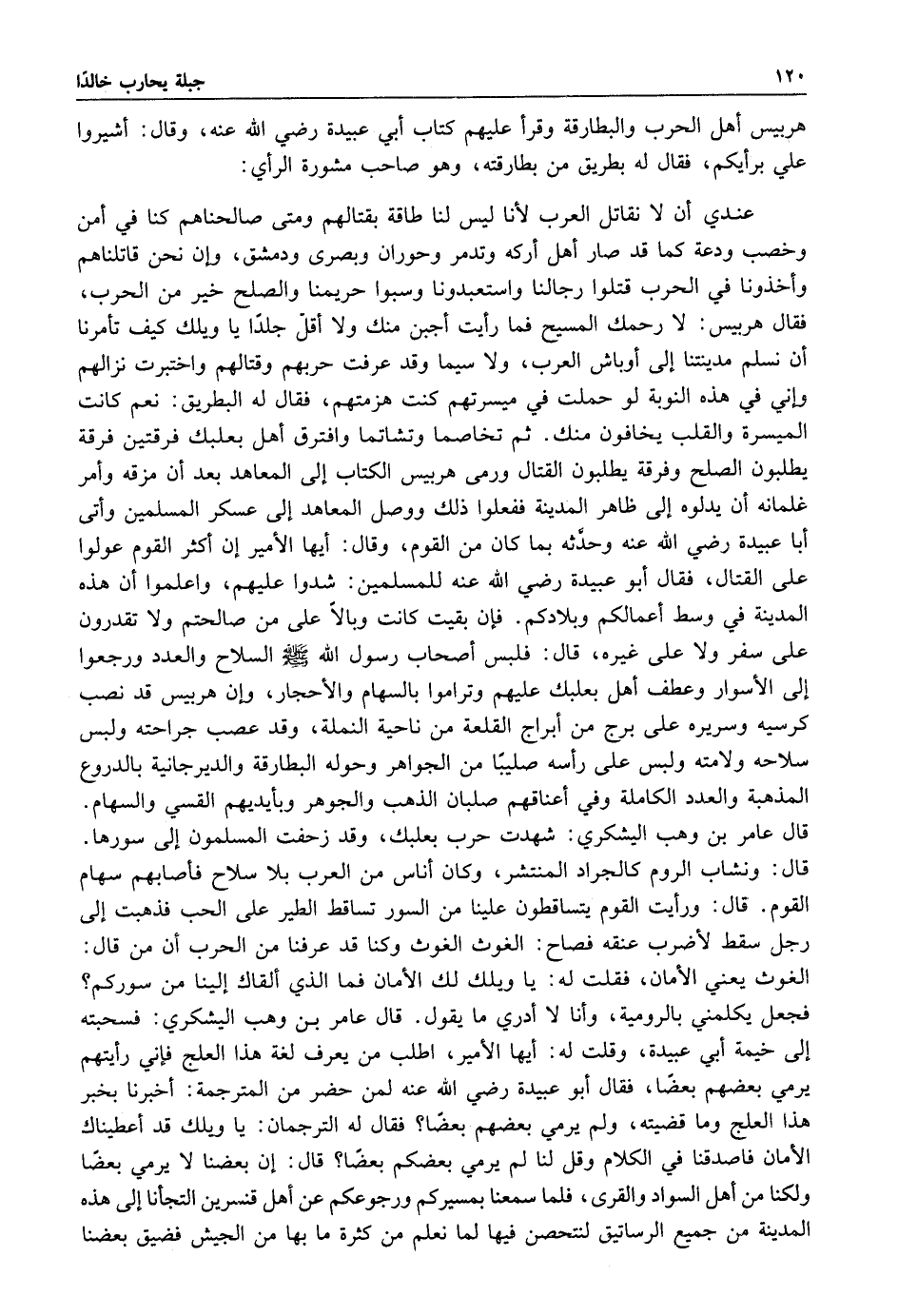 عندي أن لا نقاتل العرب لانا ليس لنا طاقة بقتالهم ومتى صالحناهم كنا في أمن وخصب ودعة كما قد صار أهل أركه وتدمر وحوران وبصرى ودمشق وأن نحن قاتلناهم وأخذونا في الحرب قتلوا رجالنا واستعبدونا وسبوا حريمنا والصلح خير من الحرب فقال هربيس لا رحمك المسيح فما رأيت اجبن منك ولا أقل جلدا يا ويلك كيف تأمرنا أن نسلم مدينتنا إلى أوباش العرب ولا سيما وقد عرفت حربهم وقتالهم واختبرت نزالهم وإني في هذه النوبة لو حملت في ميسرتهم كنت هزمتهم فقال له البطريق: نعم كانت الميسرة والقلب يخافون منك ثم تخاصما وتشاتما وافترق أهل بعلبك فرقتين فرقة يطلبون الصلح وفرقة يطلبون القتال ورمى هربيس الكتاب إلى المعاهد بعد أن مزقه وأمر غلمانه أن يدلوه إلى ظاهر المدينة ففعلوا ذلك ووصل المعاهد إلى عسكر المسلمين وأتى أبا عبيدة رضي الله عنه وحدثه بما كان من القوم وقال: أيها الأمير أن أكثر القوم عولوا على القتال فقال أبو عبيدة: رضي الله عنه للمسلمين شدوا عليهم واعلموا أن هذه المدينة في وسط اعمالكم وبلادكم فإن بقيت كانت وبالا على من صالحتم ولا تقدرون على سفر ولا على غيره قال: فلبس أصحاب رسول الله صلى الله عليه وسلم السلاح والعدد ورجعوا إلى الاسوار وعطف أهل بعلبك عليهم وتراموا بالسهام والأحجار وأن هربيس قد نصب كرسيه وسريره على برج من أبراج القلعة من ناحية النملة وقد عصب جراحته ولبس سلاحه ولامته ولبس على رأسه صليبا من الجواهر وحوله البطارقة والديرجانية بالدروع المذهبة والعدد الكاملة وفي اعناقهم صلبان الذهب والجوهر وبأيديهم القسى والسهام قال عامر بن وهب اليشكري شهدت حرب بعلبك وقد زحفت المسلمون إلى سورها قال ونشاب الروم كالجراد المنتشر وكان أناس من العرب بلا سلاح فأصابهم سهام القوم قال: ورأيت القوم يتساقطون علينا من السور تساقط الطير على الحب فذهبت إلى رجل سقط لاضرب عنقه فصاح الغوث الغوث وكنا قد عرفنا من الحرب أن من قال الغوث يعني الأمان فقلت له: يا ويلك لك الأمان فما الذي القاك إلينا من سوركم فجعل يكلمني بالرومية وأنا لا أدري ما يقول: قال عامر ابن وهب اليشكري فسحبته إلى خيمة أبي عبيدة وقلت له: أيها الأمير اطلب من يعرف لغة هذا العلج فاني رايتهم يرمي بعضهم بعضا فقال أبو عبيدة: رضي الله عنه لمن حضر من المترجمة اخبرنا بخبر هذا العلج وما قضيته ولم يرمي بعضهم بعضا فقال له الترجمان: يا ويلك قد اعطيناك الأمان فاصدقنا في الكلام قل لنا: لم يرمي بعضكم بعضا قال أن بعضنا لا يرمي بعضا ولكنا من أهل والقرى فلما سمعنا بمسيركم ورجوعكم عن أهل قنسرين التجأنا إلى هذه المدينة من جميع الرساتيق لنتحصن فيها لما نعلم من كثرة ما بها من الجيش فضيق بعضنا.