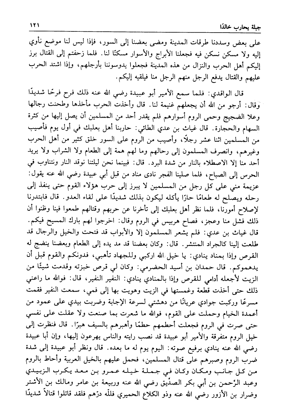 قال الواقدي: فلما سمع الأمير أبو عبيدة رضي الله عنه ذلك فرح فرحا شديدا وقال ارجو من الله أن يجعلهم غنيمة لنا قال وأخذت الحرب مأخذها وطحنت رجالها وعلا الضجيج وحمى الروم أسوارهم فلم يقدر أحد من المسلمين أن يصل إليها من كثرة السهام والحجارة قال غياث بن عدي الطائي حاربنا أهل بعلبك في أول يوم فأصيب من المسلمين اثنا عشر رجلا وأصيب من الروم على السور خلق كثير من أهل الحرب وغيرهم وانصرف المسلمون إلى رحالهم وما لهم همة إلى الطعام ولا الشراب ولا يريد أحد منا إلا الإصطلاء بالنار من شدة البرد قال فبينما نحن ليلتنا نوقد النار ونتناوب في الحرس إلى الصباح فلما صلينا الفجر نادى مناد من قبل أبي عبيدة رضي الله عنه يقول: عزيمة مني على كل رجل من المسلمين لا يبرز إلى حرب هؤلاء القوم حتى ينفذ إلى رحله ويصلح له طعاما حارا يأكله ليكون بذلك شديدا على لقاء العدو قال فابتدرنا لاصلاح أمورنا فلما نظر أهل بعلبك إلى تأخرنا عن حربهم وقتالهم طمعوا فينا وظنوا أن ذلك فشل منا وعجز فصاح هربيس في الروم وقال اخرجوا لهم بارك المسيح فيكم قال غياث بن عدي فلم يشعر المسلمون إلا والأبواب قد فتحت والخيل والرجال قد طلعت إلينا كالجراد المنتشر قال وكان بعضنا قد مد يده إلى الطعام وبعضنا ينضج له القرص وإذا بمناد ينادي يا خيل الله اركبي وللجهاد تأهبي فدونكم والقوم قبل أن يدهموكم قال حمدان بن اسيد الحضرمي وكان لي قرص خبزته وقدمت شيئا من الزيت لاجعله ادامى للقرص وإذا بالمنادي ينادي النفير النفير قال فوالله ما راعني ذلك حتى أخذت قطعة وغمستها في الزيت وهويت بها إلى فمي سمعت النفير فقمت مسرعا وركبت جوادي عريانا من دهشتي لسرعة الإجابة وضربت يدي على عمود من أعمدة الخيام وحملت على القوم فوالله ما شعرت بما صنعت ولا عقلت: على نفسي حتى صرت في الروم فجعلت أحطمهم حطما واهبرهم بالسيف هبرا قال: فنظرت إلى خيل الروم متفرقة والأمير أبو عبيدة قد نصب رايته والناس يهرعون إليها وأن أبا عبيدة رضي الله عنه ينادي برفيع صوته اليوم يوم له ما بعده قال ونظر أبو عبيدة إلى شدة ضرب الروم وصبرهم على قتال المسلمين فحمل عليهم بالخيل العربية وأحاط بالروم من كل جانب ومكان وكان في جملة خيله عمرو بن معد يكرب الزبيدي وعبد الرحمن بن ابي بكر الصديق رضي الله عنه وربيعة بن عامر ومالك بن الاشتر وضرار بن الأزور رضي الله عنه وذو الكلاع الحميري فلله درهم فلقد قاتلوا قتالا شديدا.
