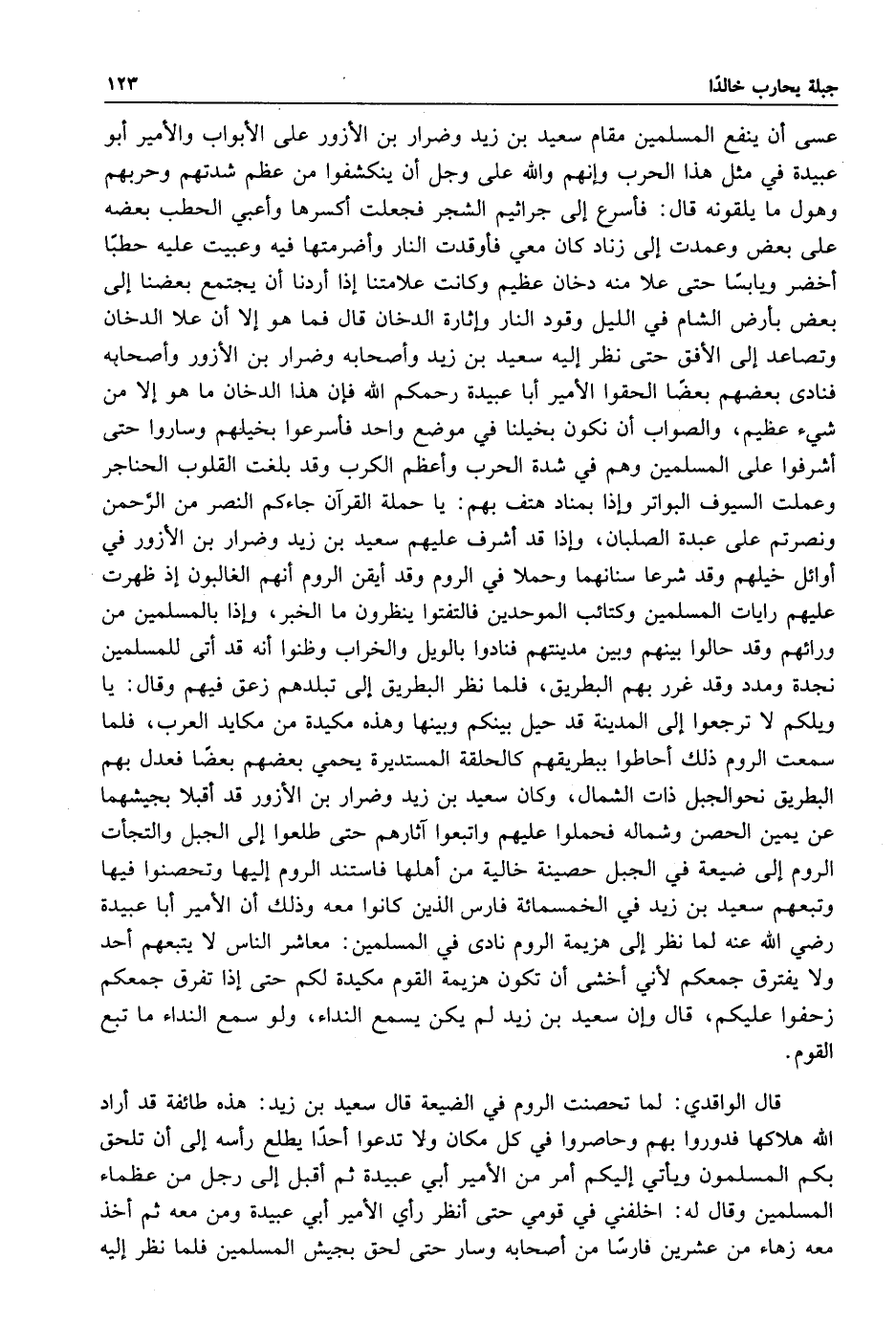 عسى أن ينفع المسلمين مقام سعيد بن زيد وضرار بن الأزور على الأبواب والأمير أبو عبيدة في مثل هذا الحرب وإنهم والله على وجل أن ينكشفوا من عظم شدتهم وحربهم وهول ما يلقونه قال فأسرعت إلى جراثيم الشجر فجعلت أكسرها وأعبي الحطب بعضه على بعض وعمدت إلى زناد كان معي فأوقدت النار واضرمتها فيه وعبيت عليه حطبا اخضر ويابسا حتى علا منه دخان عظيم وكانت علامتنا إذا أردنا أن يجتمع بعضنا إلى بعض بأرض الشام في الليل وقود النار واثارة الدخان قال فما هو إلا أن علا الدخان وتصاعد إلى الافق حتى نظراليه سعيد بن زيد وأصحابه وضرار بن الأزور وأصحابه فنادى بعضهم بعضا الحقوا الأمير أبا عبيدة رحمكم الله فإن هذا الدخان ما هو إلا من شيء عظيم والصواب أن نكون بخيلنا في موضع واحد فأسرعوا بخيلهم وساروا حتى أشرفوا على المسلمين وهم في شدة الحرب وأعظم الكرب وقد بلغت القلوب الحناجر وعملت السيوف البواتر وإذا بمناد هتف بهم يا حملة القرآن جاءكم النصر من الرحمن ونصرتم على عبدة الصلبان وإذا قد اشرف عليهم سعيد بن زيد وضرار بن الأزور في أوائل خيلهم وقد شرعا سنانهما وحملا في الروم وقد أيقن الروم إنهم الغالبون إذ ظهرت عليهم رايات المسلمين وكتائب المواحدين فالتفتوا ينظرون ما الخبر وإذا بالمسلمين من ورائهم وقد حالوا بينهم وبين مدينتهم فنادوا بالويل والخراب وظنوا إنه قد أتى للمسلمين نجدة ومدد وقد غرر بهم البطريق فلما نظر البطريق إلى تبلدهم زعق فيهم وقال: يا ويلكم لا ترجعوا إلى المدينة قد حيل بينكم وبينها وهذه مكيدة من مكايد العرب فلما سمعت الروم ذلك أحاطوا ببطريقهم كالحلقة المستديرة يحمي بعضهم بعضا فعدل بهم البطريق نحو الجبل ذات الشمال وكان سعيد بن زيد وضرار بن الأزور قد اقبلا بجيشهما عن يمين الحصن وشماله فحملوا عليهم واتبعوا آثارهم حتى طلعوا إلى الجبل والتجأت الروم إلى ضيعة في الجبل حصينة خالية من أهلها فاستند الروم إليها وتحصنوا فيها وتبعهم سعيد بن زيد في الخمسمائة فارس الذين كانوا معه وذلك أن الأمير أبا عبيدة رضي الله عنه لما نظر إلى هزيمة الروم نادى في المسلمين معاشر الناس لا يتبعهم أحد ولا يفترق جمعكم لاني اخشى أن تكون هزيمة القوم مكيدة لكم حتى إذا تفرق جمعكم زحفوا عليكم قال وأن سعيد بن زيد لم يكن يسمع النداء ولو سمع النداء ما تبع القوم.