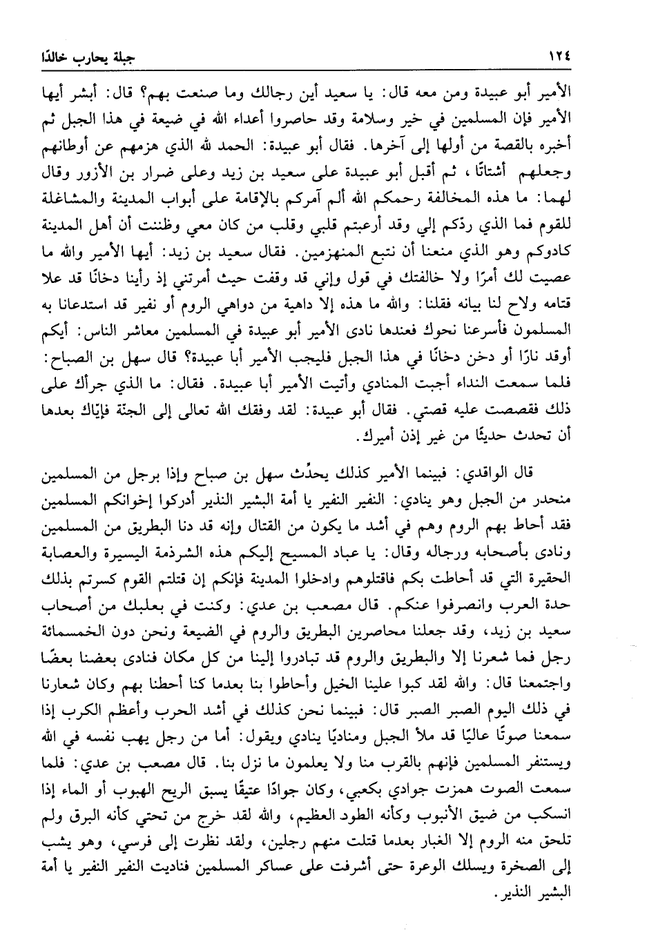 قال الواقدي: فبينما الأمير كذلك يحدث سهل بن صباح وإذا برجل من المسلمين منحدر من الجبل وهو ينادي النفير النفير يا امة البشير النذير ادركوا اخوانكم المسلمين فقد أحاط بهم الروم وهم في اشد ما يكون من القتال وانه قد دنا البطريق من المسليمن ونادى بأصحابه ورجاله وقال: يا عباد المسيح إليكم هذه الشرذمة اليسيرة والعصابة الحقيرة التي قد أحاطت بكم فاقتلوهم وادخلوا المدينة فانكم أن قتلتم القوم كسرتم بذلك حدة العرب وانصرفوا عنكم قال مصعب بن عدي وكنت في بعلبك من أصحاب سعيد بن زيد وقد جعلنا محاصرين البطريق والروم في الضيعة ونحن دون الخمسمائة رجل فما شعرنا إلا والبطريق والروم قد تبادروا إلينا من كل مكان فنادى بعضنا عضا واجتمعنا قال والله لقد كبوا علينا الخيل واحاطوا بنا بعد ما كنا أحطنا بهم وكان شعارنا في ذلك اليوم الصبر الصبر قال فبينما نحن كذلك في اشد الحرب واعظم الكرب إذ سمعنا صوتا عاليا قد ملأ الجبل ومناديا ينادي ويقول: أما من رجل يهب نفسه في الله ويسنفر المسلمين فانهم بالقرب منا ولا يعلمون ما نزل بنا قال مصعب بن عدي فلما سمعت الصوت همزت جوادي بكعبي وكان جواد عتيقا يسبق الريح الهبوب او الماء إذ انسكب من ضيق الأنبوب وكأنه الطود العظيم والله لقد خرج من تحتي كأنه البرق ولم تلحق منه الروم إلا الغبار بعد ما قتلت منهم رجلين ولقد نظرت إلى فرسي وهو يشب الصخرة ويسلك الوعرة حتى اشرفت على عساكر المسلمين فناديت النفير النفير يا أمة البشير النذير.
