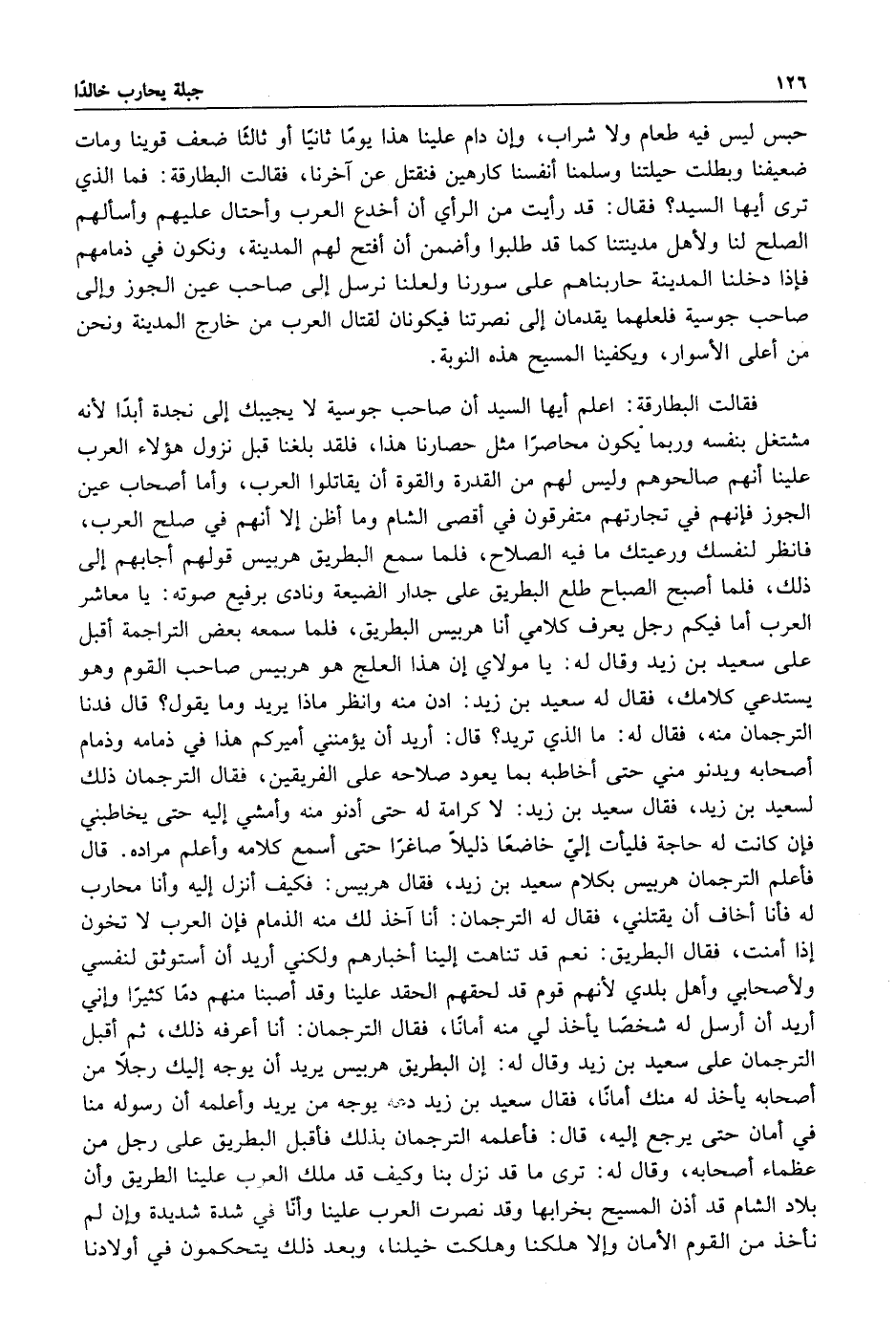 فقالت البطارقة: اعلم أيها السيد أن صاحب جوسية لا يجيبك إلى نجدة ابدا لانه مشتغل بنفسه وربما يكون محاصرا مثل حصارنا هذا فلقد بلغنا قبل نزول هؤلاء العرب علينا إنهم صالحوهم القدرة وألقوه أن يقاتلوا العرب واما أصحاب عين الجوز فانهم في تجارتهم متفرقون في اقصى الشام وما اظن إلا إنهم في صلح العرب فانظر لنفسك ورعيتك ما فيه الصلاح فلما سمع البطريق هربيس قولهم اجابهم إلى ذلك فلما اصبح الصباح طلع البطريق على جدار الضيعة ونادى برفيع صوته يا معاشر العرب أما فيكم رجل يعرف كلامي أنا هربيس البطريق فلما سمعه بعض التراجمة اقبل على سعيد بن زيد وقال له: يا مولاي أن هذا العلج هو هربيس صاحب القوم وهو يستدعي كلامك فقال له سعيد بن زيد: ادن منه وانظر ماذا يريد وما يقول: قال فدنا الترجمان منه فقال له: ما الذي تريد قال أريد أن يؤمنني أميركم هذا في ذمامه وذمام أصحابه ويدنو مني حتى أخاطبه بما يعود صلاحه على الفريقين فقال الترجمان ذلك لسعيد بن زيد فقال سعيد بن زيد لا كرامة له حتى أدنو منه وأمشي إليه حتى يخاطبني فإن كان له حاجة فليأت الي خاضعا ذليلا صاغرا حتى أسمع كلامه وأعلم مراده قال فأعلم الترجمان هربيس بكلام سعيد بن زيد فقال هربيس فكيف انزل إليه وأنا محارب له فأنا اخاف أن يقتلني فقال له الترجمان: أنا أخذ لك منه الذمام فإن العرب لا تخون إذا أمنت فقال البطريق: نعم قد تناهت إلينا أخبارهم ولكني أريد أن استوثق لنفسي ولأصحابي واهل بلدي لانهم قوم قد لحقهم الحقد علينا وقد اصبنا منهم دما كثيرا وإني أريد أن ارسل له شخصا يأخذ لي منه أمانا فقال الترجمان أنا أعرفه ذلك ثم اقبل الترجمان على سعيد بن زيد وقال له: إن البطريق هربيس يريد أن يوجه إليك رجلا من أصحابه يأخذ له منك أمانا فقال سعيد بن زيد دعه يوجه من يريد وأعلمه أن رسوله منا في أمان حتى يرجع إليه قال فأعلمه الترجمان بذلك فأقبل البطريق على رجل من عظماء أصحابه وقال له: ترى ما قد نزل بنا وكيف قد ملك العرب علينا الطريق وأن بلاد الشام قد أذن المسيح بخرابها وقد نصرت العرب علينا وأنا في شدة شديدة وأن لم نأخذ من القوم الأمان وإلا هلكنا وهلكت خيلنا وبعد ذلك يتحكمون في اولادنا.