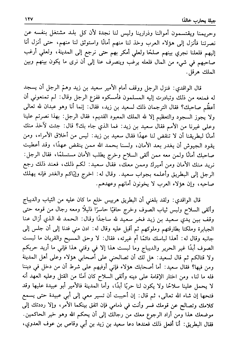 قال الواقدي: ولقد بلغني أن البطريق هربيس خلع ما كان عليه من الثياب والديباج والقى السلاح ولبس ثياب الصوف وخرج حافيا حاسرا ذليلا ومعه رجال من قومه حتى وقف بين يدي سعيد بن زيد فخر سعيد لله ساجدا وقال: الحمد لله الذي أزال عنا الجبابرة وملكنا بطارقتهم وملوكهم ثم اقبل عليه وقال له: ادن مني فدنا إلى أن جلس إلى جانبه وقال له: أهذا لباسك دائما أم غيرته فقال: لا وحق المسيح والقربان ما لبست الصوف ابدا غير الحرير والديباج وما لبست هذا إلا في وقتي هذا فاني ما أريد حربكم ولا قتالكم ثم قال لسعيد هل لك أن تصالحني على أصحابي هؤلاء وعلى أهل المدينة ومن فيها فقال سعيد أما أصحابك هؤلاء فاني أوفيهم على شرط أن من دخل في ديننا فله ما لنا ومن اختار الإقامة على دينه والقى السلاح كان آمنا من القتل وعليه العهد إنه لا يحمل علينا سلاحا ولا يكون لنا حربا ابدا واما المدينة فالأمير أبو عبيدة عليها وقد فتحها أن شاء الله تعالى ثم قال: أن أحببت أن تسير معي إلى أبي عبيدة حتى يسمع كلامك وتصالح عن قومك فسر وانت في ذمامي فإن اتفق بينكما الأمر وإلا رددتك إلى موضعك هذا ومن أراد الرجوع معك من رجالك إلى أن يحكم الله وهو خير الحاكمين فقال البطريق أنا أفعل ذلك فعندها دعا سعيد بن زيد سعد بن ابي وقاص بن عوف العدوى.