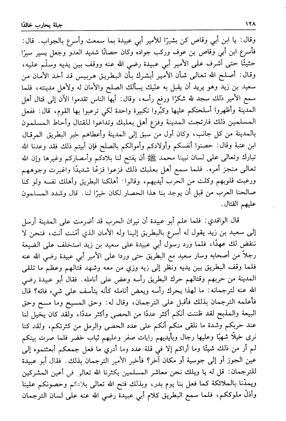 قال الواقدي: فلما علم أبو عبيدة أن نيران الحرب قد اضرمت على المدينة أرسل إلى سعيد بن زيد يقول له: أسرع بالبطريق إلينا وله الأمان الذي أمنت أنت فنحن لا ننقض لك عهدا فلما ورد رسول أبي عبيدة على سعيد بن زيد استخلف على الضيعة رجلا من أصحابه وسار سعيد مع البطريق حتى وردا على الأمير أبي عبيدة رضي الله عنه فلما وقف البطريق بين يديه ونظر إلى زيه وزي من معه وشهد قتالهم وعظم ما تلقى المدينة من حربهم وقتالهم حرك البطريق رأسه وعض على أنامله فقال أبو عبيدة: رضي الله عنه لترجمانه ما لهذا يحرك رأسه ويعض أنامله كأنه يتأسف على شيء فاته قال فأعلمه الترجمان بذلك فأقبل على الترجمان وقال له: وحق المسيح وما مسح وحق البيعة والمذبح لقد ظننت إنكم أكثر عددا من الحصى وأكثر مددا ولقد كان يخيل لنا عند حربكم وشدة ما نلقى منكم إنكم على عدد الحصى والرمل من كثرتكم ولقد كنا نرى خيلا شهبا وعليها رجال وبأيديهم رايات صفر وعليهم ثياب خضر فلما صرت بينكم لم أر من ذلك شيئا وما أراكم إلا في قلة عدد وما ادري ما فعل جمعكم أبعثتموه إلى عين الجوز او إلى جوسيه أو مكان آخر فأخبر الأمير الترجمان بذلك فقال أبو عبيدة: للترجمان قل له: يا ويلك نحن معاشر المسلمين يكثرنا الله تعالى في أعين المشركين ويمدنا بالملائكة كما فعل بنا يوم بدر وبذلك فتح الله تعالى بلادكم وحصونكم علينا وأذل ملوككم فلما سمع البطريق كلام أبي عبيدة رضي الله عنه على لسان الترجمان.