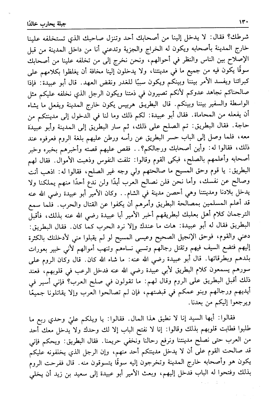 فقالوا: أيها السيد أنا لا نطيق هذا المال فقالوا: يا ويلكم علي وحدي ربع ما طلبوا فطابت قلوبهم بذلك وقالوا: أنا لا نفتح الباب إلا لك وحدك ولا يدخل معك أحد من العرب حتى نصلح مدينتنا ونرفع رحالنا ونخفي حريمنا فقال البطريق ويحكم فإني قد صالحت القوم على أن لا يدخل مدينتكم أحد منهم وأن الرجل الذي يخلفونه عليكم يكون هو وأصحابه خارج المدينة وتخرجون إليه سوقا يتسوقون منه قال ففرحت الروم بذلك وفتحوا له الباب فدخل إليهم وبعث الأمير أبو عبيدة إلى سعيد بن زيد أن يخلي.