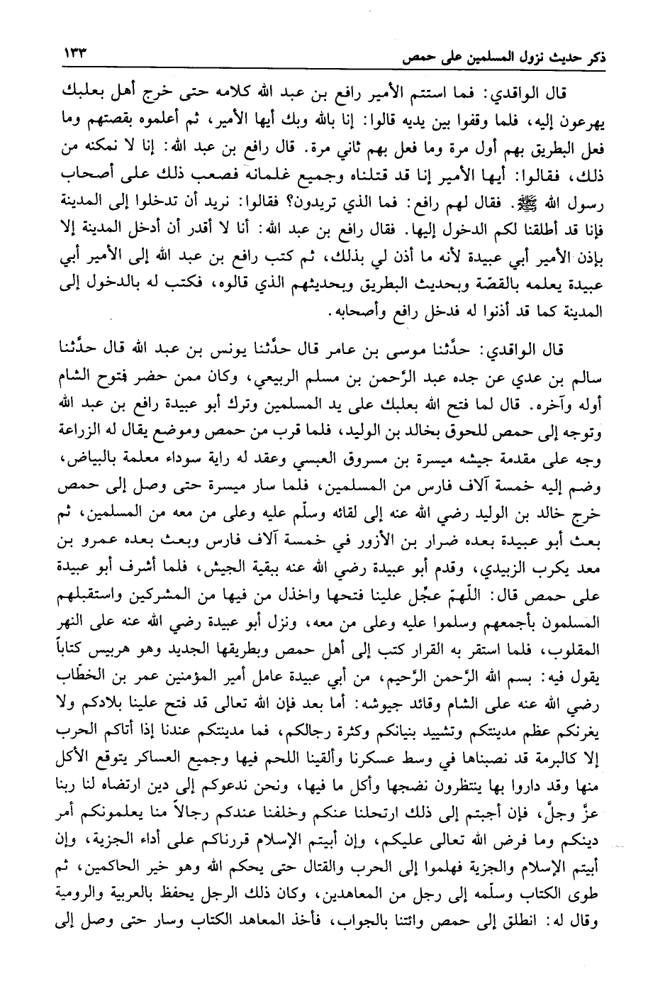 قال الواقدي: حدثنا موسى بن عامر قال حدثنا يونس بن عبد الله قال حدثنا سالم بن عدي عن جده عبد الرحمن بن مسلم الربيعي وكان ممن حضر فتوح الشام اوله وآخره قال لما فتح الله بعلبك على يد المسلمين وترك أبو عبيدة رافع بن عبد الله وتوجه إلى حمص للحوق بخالد بن الوليد فلما قرب من حمص موضع يقال له الزراعة: وجه على مقدمة جيشه ميسرة بن مسروق العبسي وعقد له راية سوداء معلمة بالبياض وضم إليه خمسة آلاف فارس من المسلمين فلما سار ميسرة حتى وصل إلى حمص خرج خالد بن الوليد رضي الله عنه إلى لقائه وسلم عليه وعلى من معه من المسلمين ثم بعث أبو عبيدة بعده ضرار بن الأزور في خمسة آلاف فارس وبعث بعده عمرو بن معد يكرب الزبيدي وقدم أبو عبيدة رضي الله عنه ببقية الجيش فلما اشرف أبو عبيدة على حمص قال اللهم عجل علينا فتحها وأخذل من فيها من المشركين واستقبلهم المسلمون فلما استقر به القرار كتب إلى أهل حمص وبطريقها الجديد وهو هربيس كتابا يقول فيه: بسم الله الرحمن الرحيم من أبي عبيدة عامل أمير المؤمنين عمر بن الخطاب رضي الله عنه على الشام وقائد جيوشه أما بعد فإن الله تعالى قد فتح علينا بلادكم ولا يغرنكم عظم مدينتكم وتشييد بنيانكم وكثرة رجالكم فما مدينتكم عندنا إذا أتاكم الحرب إلا كالبرمة قد نصبناها في وسط عسكرنا والقينا اللحم فيها وجميع العساكر يتوقع الأكل منها وقد داروا بها ينتظرون نضجها واكل ما فيها ونحن ندعوكم إلى دين ارتضاه لنا ربنا عز وجل فإن اجبتم إلى ذلك ارتحلنا عنكم وخلفنا عندكم رجالا منا يعلمونكم أمر دينكم وما فرض الله تعالى عليكم وأن أبيتم الإسلام قررناكم على اداء الجزية وأن أبيتم الإسلام والجزية فهلموا إلى الحرب والقتال حتى يحكم الله وهو خير الحاكمين ثم طوى الكتاب وسلمه إلى رجل من المعاهدين وكان ذلك الرجل يحفظ بالعربية والرومية وقال له: انطلق إلى حمص وائتنا بالجواب فأخذ المعاهد الكتاب وسار حتى وصل إلى.