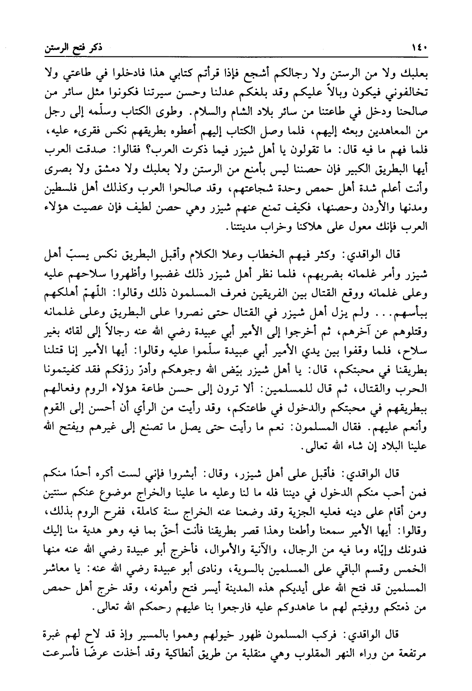 بعلبك ولا من الرستن ولا رجالكم أشجع فإذا قرأتم كتابي هذا فادخلوا في طاعتي ولا تخالفوني فيكون وبالا عليكم وقد بلغكم عدلنا وحسن سيرتنا فكونوا مثل سائر من صالحنا ودخل في طاعتنا من سائر بلاد الشام والسلام وطوى الكتاب وسلمه إلى رجل من المعاهدين وبعثه إليهم فلما وصل الكتاب إليهم أعطوه بطريقهم نكس فقرىء عليه فلما فهم ما فيه قال: ما تقولون يا أهل شيزر فيما ذكرت العرب فقالوا: صدقت العرب أيها البطريق الكبير فإن حصننا ليس بأمنع من الرستن ولا بعلبك ولا دمشق ولا بصرى وأنت اعلم شدة أهل حمص وحدة شجاعتهم وقد صالحوا العرب وكذلك أهل فلسطين ومدنها والأردن وحصنها فكيف تمنع عنهم شيزر وهي حصن لطيف فإن عصيت هؤلاء العرب فانك معول على هلاكنا وخراب مدينتنا.