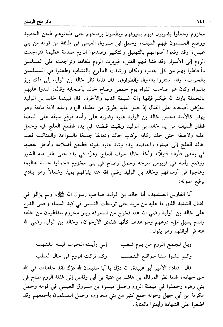 أنا الفارس الصنديد أنا خالد بن الوليد صاحب رسول الله صلى الله عليه وسلم ولم يزالوا في القتال الشديد الذي ما عليه من مزيد حتى توسطت الشمس في كبد السماء وحمى الدرع على خالد بن الوليد رضي الله عنه فخرج من المعركة وبنو مخزوم يتقاطرون من خلفه والدم يسيل ملء درعهم وسواعدهم كأنها شقائق الأرجوان وخالد بن الوليد رضي الله عنه في أوائلهم وهو يقول: