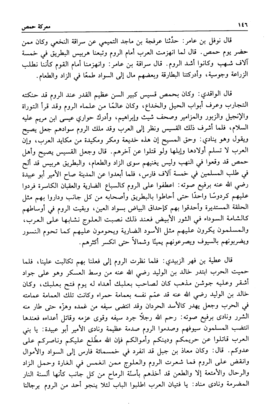 قال الواقدي: وكان بحمص قسيس كبير السن عظيم القدر عند الروم قد حنكته التجارب وعرف أبواب الحيل والخداع وكان عالما من علماء الروم وقد قرأ التوراة والإنجيل والزبور والمزأمير وصحف شيث وابراهيم وأدرك حواري عيسى ابن مريم عليه السلام فلما أشرف ذلك القسيس ونظر إلى العرب وقد ملك الروم سوادهم جعل يصيح ويقول وهو ينادي: وحق المسيح أن هذه خديعة ومكر ومكيدة من مكايد العرب وأن العرب لا تسلم اولادها وابلها ولو قتلوا عن آخرهم قال وجعل القسيس يصيح وأهل حمص قد وقعوا في النهب وليس يغنيهم سوى الزاد والطعام والبطريق هربيس قد الح في طلب المسلمين في خمسة آلاف فارس فلما أبعدوا عن المدينة صاح الأمير أبو عبيدة رضي الله عنه برفيع صوته اعطفوا على الروم كالسباع الضارية والعقبان الكاسرة فردوا عليهم كردوسا واحدا حتى أحاطوا بالبطريق وأصحابه من كل جانب وداروا بهم مثل الحلقة المستديرة واحدقوا بهم كاحداق البياض بسواد العين وبقيت الروم في اوساطهم كالشامة السوداء في الثور الأبيض فعند ذلك نصبت العلوج نشابها على العرب والمسلمون يكرون عليهم مثل الأسود الضارية ويحومون عليهم كما تحوم النسور ويضربونهم بالسيوف ويصرعونهم يمينا وشمالا حتى إنكسر أكثرهم.