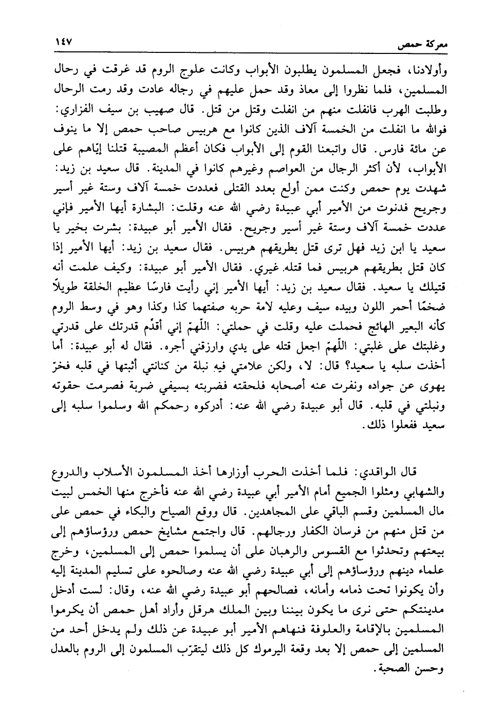 وأولادنا فجعل المسلمون يطلبون الأبواب وكانت علوج الروم قد غرقت في رحال المسلمين فلما نظروا إلى معاذ وقد حمل عليهم في رحاله عادت وقد رمت الرحال وطلبت الهرب فانفلت منهم ما انفلت وقتل من قتل قال صهيب بن سيف الفزاري فوالله ما انفلت من الخمسة آلاف الذين كانوا مع هربيس صاحب حمص إلا ما ينوف عن مائة فارس قال واتبعنا القوم إلى الأبواب فكان اعظم المصيبة قتلنا إياهم على الأبواب لأن أكثر الرجال من العواصم وغيرهم كانوا في المدينة قال سعيد بن زيد شهدت يوم حمص وكنت ممن أولع بعدد القتلى فعددت خمسة آلاف وستة غير أسير وجريح فدنوت من الأمير أبي عبيدة رضي الله عنه وقلت البشارة: أيها الأمير فاني عددت خمسة آلاف وستة غير اسير وجريح فقال الأمير أبو عبيدة بشرت بخير يا سعيد يا ابن زيد فهل ترى قتل بطريقهم هربيس فقال سعيد بن زيد أيها الأمير إذا كان قتل بطريقهم هربيس فما قتله غيري فقال الأمير أبو عبيدة وكيف علمت إنه قتيلك يا سعيد فقال سعيد بن زيد أيها الأمير إني رأيت فارسا عظيم الخلقة طويلا ضخما أحمر اللون وبيده سيف وعليه لامة حربه صفتهما كذا وكذا وهو في وسط الروم كأنه البعير الهائج فحملت عليه وقلت في حملتي: اللهم إني اقدم قدرتك على قدرتي وغلبتك على غلبتي اللهم اجعل قتله على يدي وارزقني اجره فقال له أبو عبيدة: إما أخذت سلبه يا سعيد قال: لا ولكن علامتي فيه نبلة من كنانتي أثبتها في قلبه فخر يهوي عن جواده ونفرت عنه أصحابه فلحقته فضربته بسيفي ضربة فصرمت حقوته ونبلتي في قلبه قال أبو عبيدة رضي الله عنه: أدركوه رحمكم الله وسلموا سلبه إلى سعيد ففعلوا ذلك.