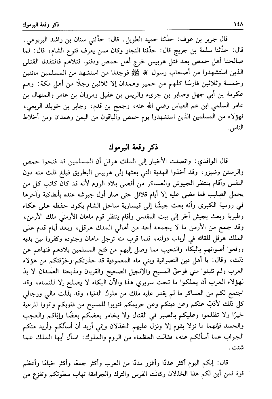 قال الواقدي: واتصلت الأخبار إلى الملك هرقل أن المسلمين قد فتحوا حمص والرستن وشيزر وقد أخذوا الهدية التي بعثها إلى هربيس البطريق فبلغ ذلك منه دون النفس وأقام ينتظر الجيوش والعساكر من أقصى بلاد الروم لانه قد كان كاتب كل من يحمل الصليب فما مضى عليه إلا أيام قلائل حتى صار أول جيوشه عنده بانطاكية وآخرها في رومية الكبرى وانه بعث جيشا إلى قيسارية ساحل الشام يكون حفظه على عكاء وطبرية وبعث بجيش آخر إلى بيت المقدس وأقام ينتظر قوم ماهان الأرمني ملك الأرمن وقد جمع من الأرمن ما لا يجمعه أحد من أهالي الملك هرقل وبعد أيام قدم على الملك هرقل للقائه في أرباب دولته فلما قرب منه ترجل ماهان وجنوده وكفروا بين يديه ورفعا اصواتهم بالبكاء والنحيب مما وصل إليهم من فتح المسلمين بلادهم فنهاهم عن ذلك وقال: يا أهل دين النصرانية وبني ماء المعمودية قد حذرتكم وخوفتكم من هؤلاء العرب ولم تقبلوا مني فوحق المسيح والإنجيل الصحيح والقربان ومذبحنا المعمدان لا بد لهؤلاء العرب أن يملكوا ما تحت سريري هذا والآن البكاء لا يصلح إلا للنساء وقد اجتمع لكم من العساكر ما لم يقدر عليه ملك من ملوك الدنيا وقد بذلت مالي ورجالي كل ذلك لاذب عنكم وعن دينكم وعن حريمكم فتوبوا للمسيح من ذنوبكم وانووا للرعية خيرا ولا تظملوا وعليكم بالصبر في القتال ولا يخامر بعضكم بعضا وإياكم والعجب والحسد فانهما ما نزلا بقوم إلا ونزل عليهم الخذلان وإني أريد أن أسألكم وأريد منكم الجواب عما أسألكم عنه فقالت العظماء من الروم والملوك: اسأل أيها الملك عما شئت.