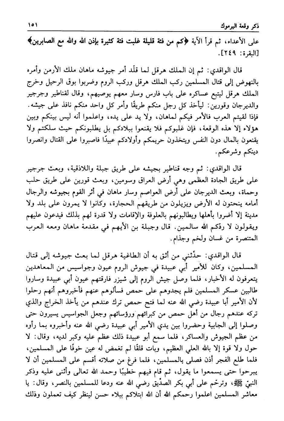 قال الواقدي: ثم أن الملك هرقل لما قلد أمر جيوشه ماهان ملك الأرمن وأمره بالنهوض إلى قتال المسلمين ركب الملك هرقل وركب الروم وضربوا بوق الرحيل وخرج الملك هرقل ليتبع عساكره على باب فارس وسار معهم يوصيهم وقال لقناطير وجرجير والديرجان وقورين ليأخذ كل رجل منكم طريقا وأمر كل واحد منكم نافذ على جيشه فإذا لقيتم العرب فالأمر فيكم لماهان ولا يد على يده واعلموا إنه ليس بينكم وبين هؤلاء إلا هذه الوقعة فإن غلبوكم فلا يقنعوا ببلادكم بل يطلبونكم حيث سلكتم ولا يقنعون بالمال دون النفس ويتخذون حريمكم واولادكم عبيدا فاصبروا على القتال وانصروا دينكم وشرعكم.
