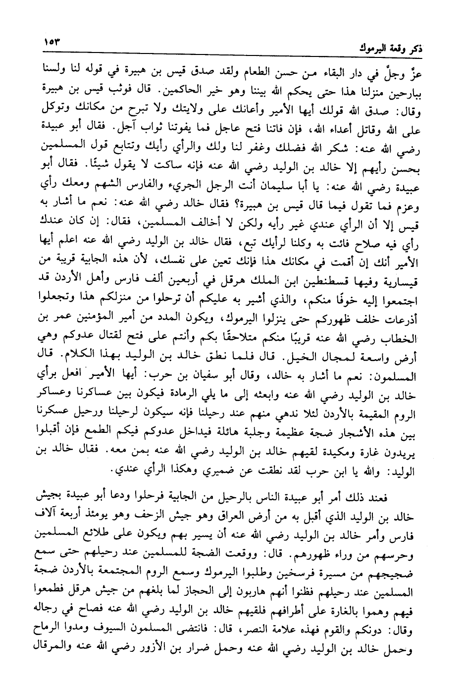 عز وجل في دار البقاء من حسن الطعام ولقد صدق قيس بن هبيرة في قوله لنا ولسنا ببارحين منزلنا هذا حتى يحكم الله بيننا وهو خير الحاكمين قال فوثب قيس بن هبيرة وقال صدق الله قولك أيها الأمير وأعانك على ولايتك ولا تبرح من مكانك وتوكل على الله وقاتل أعداء الله فإن فاتنا فتح عاجل فما يفوتنا ثواب آجل فقال أبو عبيدة: رضي الله عنه شكر الله فضلك وغفر لنا ولك والرأي رأيك وتتابع قول المسلمين بحسن رأيهم إلا خالد بن الوليد رضي الله عنه فإنه ساكت لا يقول شيئا فقال أبو عبيدة: رضي الله عنه يا أبا سليمان أنت الرجل الجريء والفارس الشهم ومعك رأي وعزم فما تقول فيما قال قيس بن هبيرة فقال خالد رضي الله عنه: نعم ماأشار به قيس إلا أن الرأي عندي غير رأيه ولكن لا اخالف المسلمين فقال أن كان عندك رأي فيه صلاح فائت به وكلنا لرأيك تبع فقال خالد بن الوليد رضي الله عنه: اعلم أيها الأمير إنك أن أقمت في مكانك هذا فانك تعين على نفسك لأن هذه الجابية قريبة من قيسارية وفيها قسطنطين ابن الملك هرقل في أربعين ألف فارس وأهل الأردن قد اجتمعوا إليه خوفا منكم والذي أشير به عليكم أن ترحلوا من منزلكم هذا وتجعلوا أذرعات خلف ظهوركم حتى ينزلوا اليرموك ويكون المدد من أمير المؤمنين عمر بن الخطاب رضي الله عنه قريبا منكم متلاحقا بكم وأنتم على فتح لقتال عدوكم وهي أرض واسعة لمجال الخيل قال فلما نطق خالد بن الوليد بهذا الكلام قال المسلمون: نعم ما أشار به خالد وقال أبو سفيان بن حرب أيها الأمير افعل برأي خالد بن الوليد رضي الله عنه وابعثه إلى ما يلي الرمادة فيكون بين عساكرنا وعساكر الروم المقيمة بالأردن لئلا ندهي منهم عند رحيلنا فإنه سيكون لرحيلنا ورحيل عسكرنا بين هذه الاشجار ضجة عظيمة وجلبة هائلة فيداخل عدوكم فيكم الطمع فإن اقبلوا يريدون غارة ومكيدة لقيهم خالد بن الوليد رضي الله عنه بمن معه فقال خالد بن الوليد: والله يا ابن حرب لقد نطقت عن ضميري وهكذا الرأي عندي.