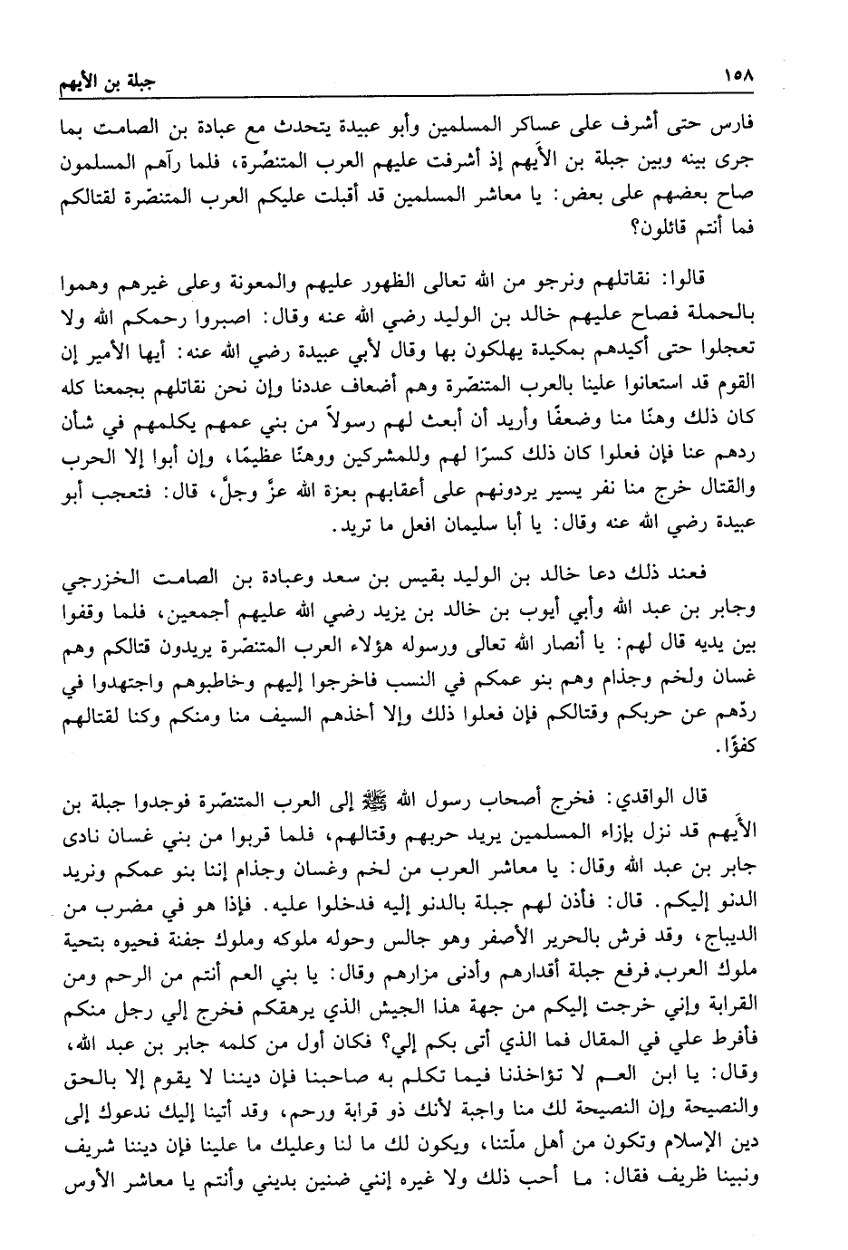 قال الواقدي: فخرج أصحاب رسول الله صلى الله عليه وسلم إلى العرب المتنصرة فوجدوا جبلة بن الأيهم قد نزل بإزاء المسلمين يريد حربهم وقتالهم فلما قربوا من بني غسان نادى جابر ابن عبد الله وقال: يا معاشر العرب من لخم وغسان وجذام اننا بنو عمكم ونريد الدنو إليكم قال فأذن لهم جبلة بالدنو إليه فدخلوا عليه فإذا هو في مضرب من الديباج وقد فرش بالحرير الأصفر وهو جالس وحوله ملوكه وملوك جفنة فحيوه بتحية ملوك العرب فرفع جبلة أقدارهم وأدنى مزارهم وقال: يا بني العم أنتم من الرحم ومن القرابة وإني خرجت إليكم من جهة هذا الجيش الذي يرهقكم فخرج الي رجل منكم فأفرط علي في المقال فما الذي أتى بكم الي فكان أول من كلمه جابر بن عبد الله وقال: يا ابن العم لا تؤاخذنا فيما تكلم به صاحبنا فإن ديننا لا يقوم إلا بالحق والنصيحة وأن النصيحة لك منا واجبة لانك ذو قرابة ورحم وقد أتينا إليك ندعوك إلى دين الإسلام وتكون من أهل ملتنا ويكون لك ما لنا وعليك ما علينا فإن ديننا شريف ونبينا ظريف فقال وما أحب ذلك ولا غيره انني ضنين بديني وأنتم يا معاشر الأوس