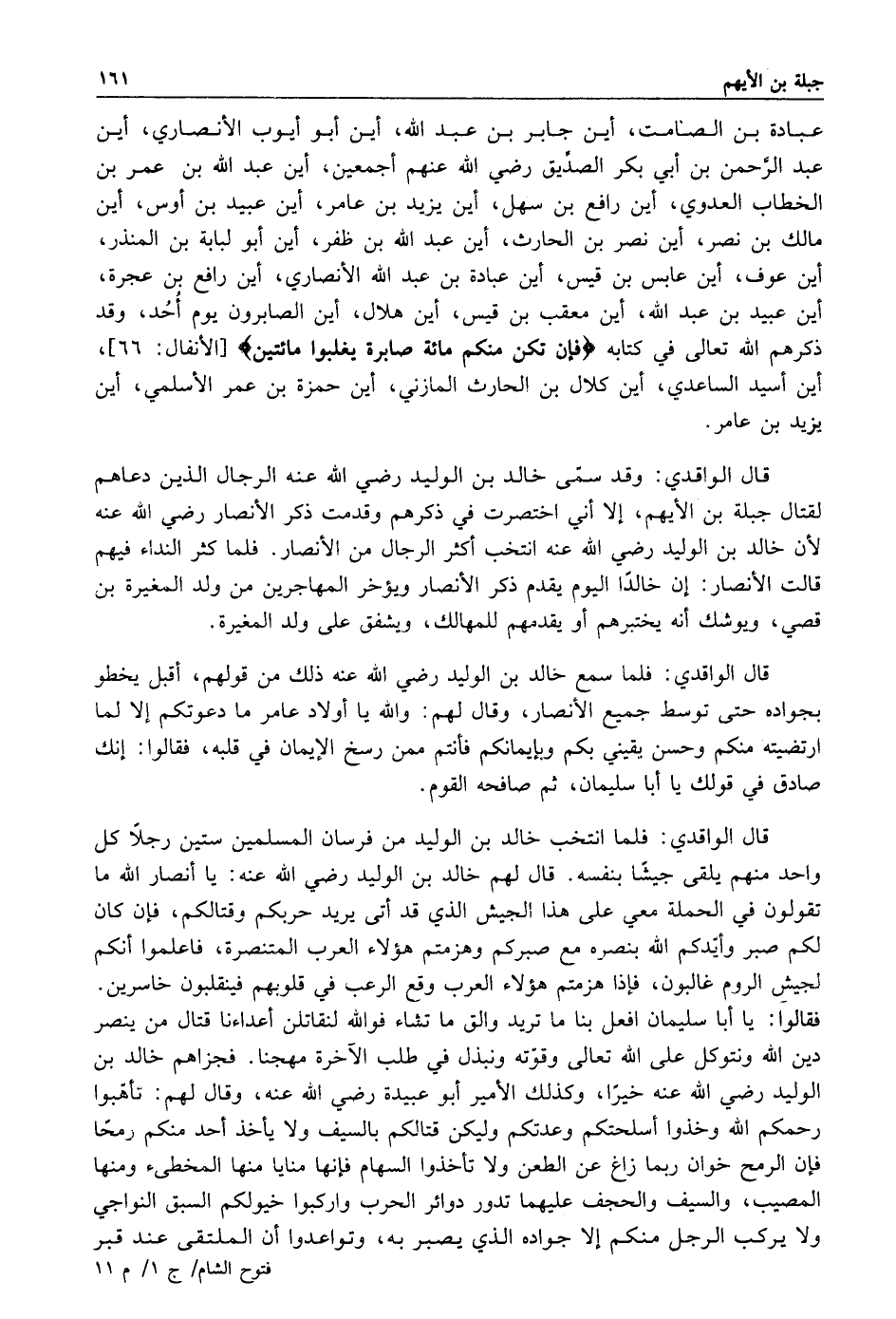 قال الواقدي: وقد سمى خالد بن الوليد رضي الله عنه الرجال الذين دعاهم لقتال جبلة بن الأيهم إلا إني اختصرت في ذكرهم وقدمت ذكر الأنصار رضي الله عنه لأن خالد بن الوليد رضي الله عنه انتخب أكثر الرجال من الأنصار فلما كثر النداء فيهم قالت الأنصار: إن خالدا اليوم يقدم ذكر الأنصار ويؤخر المهاجرين من ولد المغيرة بن قصي ويوشك إنه يختبرهم أو يقدمهم للمهالك ويشفق على ولد المغيرة.