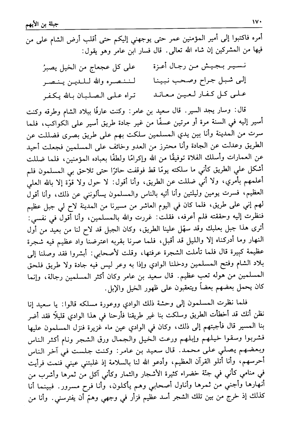 قال وسار يجد السير قال سعيد بن عامر وكنت عارفا ببلاد الشام وطرقه وكنت أسير إليه في السنة مرة أو مرتين عسفا من غير جادة طريق اسير على الكواكب فلما سرت من المدينة وأنا بين يدي المسلمين سلكت بهم على طريق بصرى فضللت عن الطريق وعدلت عن الجادة وأنا محترز من العدو وخائف على المسلمين فجعلت أحيد عن العمارات وأسلك الفلاة توفيقا من الله واكراما ولطفا بعباده المؤمنين فلما ضللت أشكل علي الطريق كأني ما سلكته يوما قط فوقفت حائرا حتى تلاحق بي المسلمون فلم أعلمهم بأمري ولا إني ضللت عن الطريق وأنا أقول لا حول ولا قوة إلا بالله العلي العظيم فسرت يومين وليلتين وأنا أتيه بالناس والمسلمون يسألونني عن ذلك وأنا أقول لهم إني على طريق فلما كان في اليوم العاشر من مسيرنا من المدينة لاح لي جبل عظيم فنظرت إليه وحققته فلم أعرفه فقلت: غررت والله بالمسلمين وأنا أقول في نفسي أترى هذا جبل بعلبك وقد سهل علينا الطريق وكان الجبل قد لاح لنا من بعيد من أول النهار وما أدركناه إلا والليل قد أقبل فلما صرنا بقربه اعترضنا واد عظيم فيه شجرة عظيمة كبيرة قال فلما تاملت الشجرة عرفتها وقلت لأصحابي: أبشروا فقد وصلنا إلى بلاد الشام وفتح المسلمين ودخلنا الوادي وإذا به وعر ليس فيه جادة ولا طريق فلحق المسلمين من هوله تعب عظيم قال سعيد بن عامر وكان أكثر المسلمين رجالة وإنما كان يحمل بعضهم بعضا ويتعقبون على ظهور الخيل والإبل.