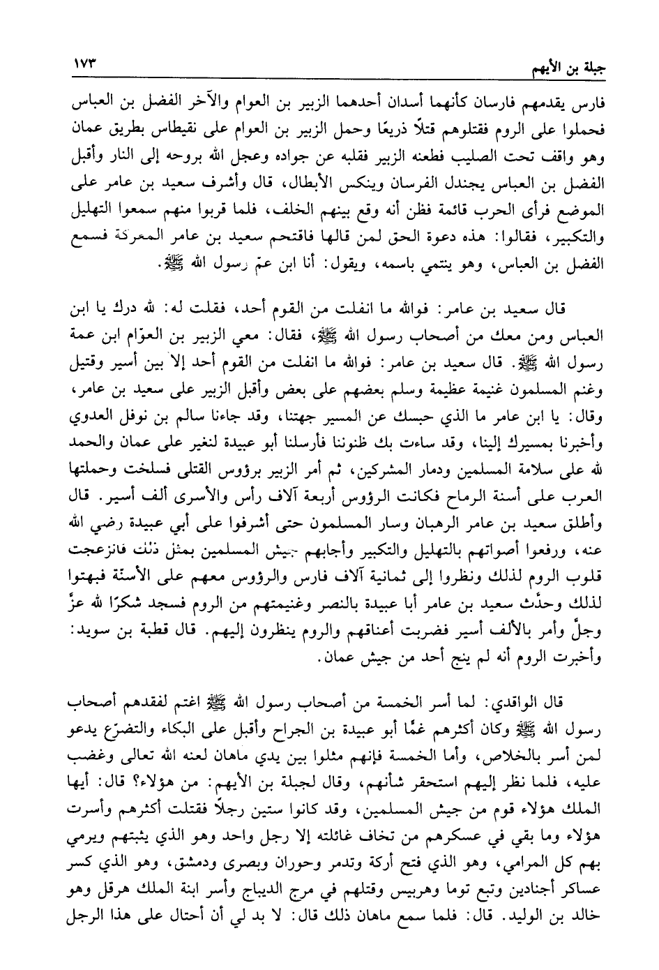 فارس يقدمهم فارسان كأنهما أسدان أحدهما الزبير بن العوام والآخر الفضل بن العباس فحملوا على الروم فقتلوهم قتلا ذريعا وحمل الزبير بن العوام على نقيطاس بطريق عمان وهو واقف تحت الصليب فطعنه الزبير فقلبه عن جواده وعجل الله بروحه إلى النار وأقبل الفضل بن العباس يجندل الفرسان وينكس الأبطال قال وأشرف سعيد بن عامر على الموضع فرأى الحرب قائمة فظن إنه وقع بينهم الخلف فلما قربوا منهم سمعوا التهليل والتكبير فقالوا: هذه دعوة الحق لمن قالها فاقتحم سعيد ابن عامر المعركة فسمع الفضل بن العباس وهو ينتمي باسمه ويقول: أنا ابن عم رسول الله صلى الله عليه وسلم.