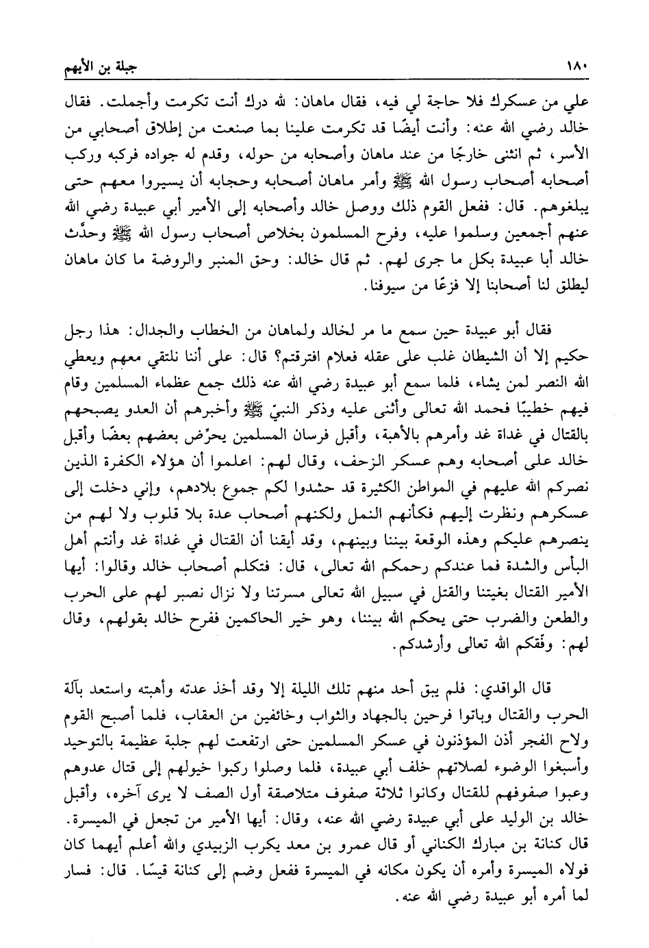 فقال أبو عبيدة: حين سمع ما مر لخالد ولماهان من الخطاب والجدال هذا رجل حكيم إلا أن الشيطان غلب على عقله فعلام افترقتم قال على أننا نلتقي معهم ويعطي الله النصر لمن يشاء فلما سمع أبو عبيدة رضي الله عنه ذلك جمع عظماء المسلمين وقام فيهم خطيبا فحمد الله تعالى وأثنى عليه وذكر النبي صلى الله عليه وسلم وأخبرهم أن العدو يصبحهم بالقتال في غداة غد وأمرهم بالأهبة وأقبل فرسان المسلمين يحرض بعضهم بعضا وأقبل خالد على أصحابه وهم عسكر الزحف وقال لهم: علموا أن هؤلاء الكفرة الذين نصركم الله عليهم في المواطن الكثيرة قد حشدوا لكم جموع بلادهم وإني دخلت إلى عسكرهم ونظرت إليهم فكانهم النمل ولكنهم أصحاب عدة بلا قلوب ولا لهم من ينصرهم عليكم وهذه الوقعة بيننا وبينهم وقد أيقنا أن القتال في غداة غد وانتم أهل البأس والشدة فما عندكم رحمكم الله تعالى قال فتكلم أصحاب خالد وقالوا: أيها الأمير القتال بغيتنا والقتل في سبيل الله تعالى مسرتنا ولا نزال نصبر لهم على الحرب والطعن والضرب حتى يحكم الله بيننا وهو خير الحاكمين ففرح خالد بقولهم وقال لهم: وفقكم الله تعالى وأرشدكم.