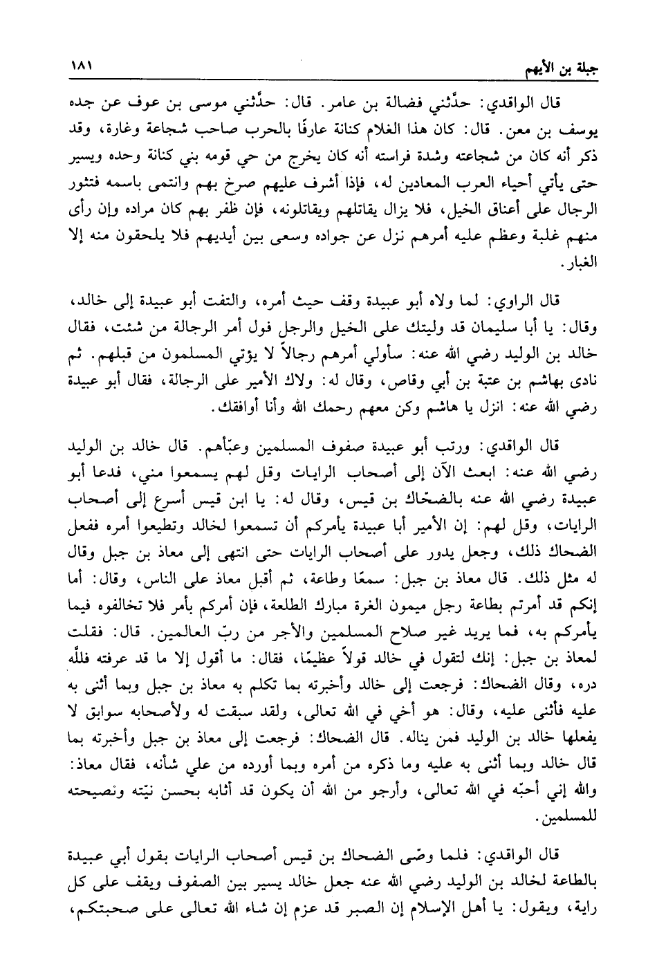 قال الواقدي: ورتب أبو عبيدة صفوف المسلمين وعبأهم قال خالد بن الوليد رضي الله عنه: ابعث الآن إلى أصحاب الرايات وقل لهم يسمعوا مني فدعا أبو عبيدة رضي الله عنه بالضحاك بن قيس وقال له: يا بن قيس اسرع إلى أصحاب الرايات وقل لهم أن الأمير أبا عبيدة يأمركم أن تسمعوا لخالد وتطيعوا أمره ففعل الضحاك ذلك وجعل يدور على أصحاب الرايات حتى انتهى إلى معاذ بن جبل وقال له: مثل ذلك قال معاذ بن جبل سمعا وطاعة ثم اقبل معاذ على الناس وقال: أما إنكم قد امرتم بطاعة رجل ميمون الغرة مبارك الطلعة فإن أمركم بأمر فلا تخالفوه فيما يأمركم به فما يريد غير صلاح المسلمين والأجر من رب العالمين قال فقلت لمعاذ بن جبل: إنك لتقول في خالد قولا عظيما فقال: ما أقول إلا ما قد عرفته فالله رده وقال الضحاك فرجعت إلى خالد واخبرته بما تكلم به معاذ بن جبل وبما أثنى به عليه فأثنى وقال هو أخي في الله تعالى ولقد سبقت له ولأصحابه سوابق لا يفعلها خالد بن الوليد فمن يناله قال الضحاك فرجعت إلى معاذ بن جبل وأخبرته بما قال خالد: وبما أثنى به عليه وما ذكره من أمره وبما أورده من علي شأنه فقال معاذ والله إني أحبه في الله تعالى وأرجو من الله أن يكون قد اثابه بحسن نيته ونصيحته للمسلمين.