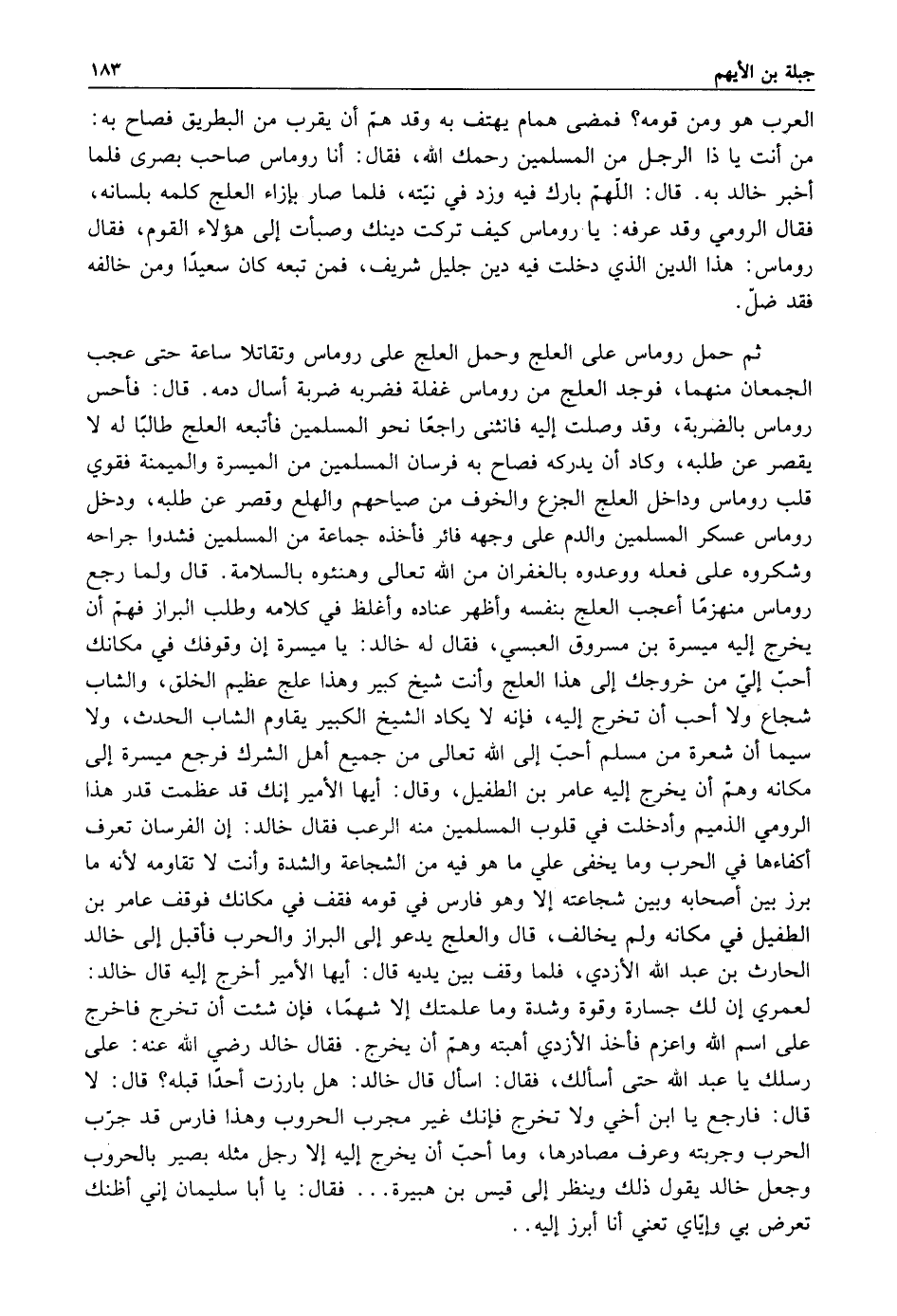 العرب هو ومن قومه فمضى همام يهتف به وقد هم أن يقرب من البطريق فصاح به من أنت يا ذا الرجل من السلمين رحمك الله فقال أنا روماس صاحب بصرى فلما أخبر خالد به قال: اللهم بارك فيه وزد في نيته فلما صار بازاء العلج كلمه بلسانه فقال الرومي وقد عرفه يا روماس كيف تركت دينك وصبأت إلى هؤلاء القوم فقال روماس هذا الدين الذي دخلت فيه دين جليل شريف فمن تبعه كان سعيدا ومن خالفه فقد ضل.
