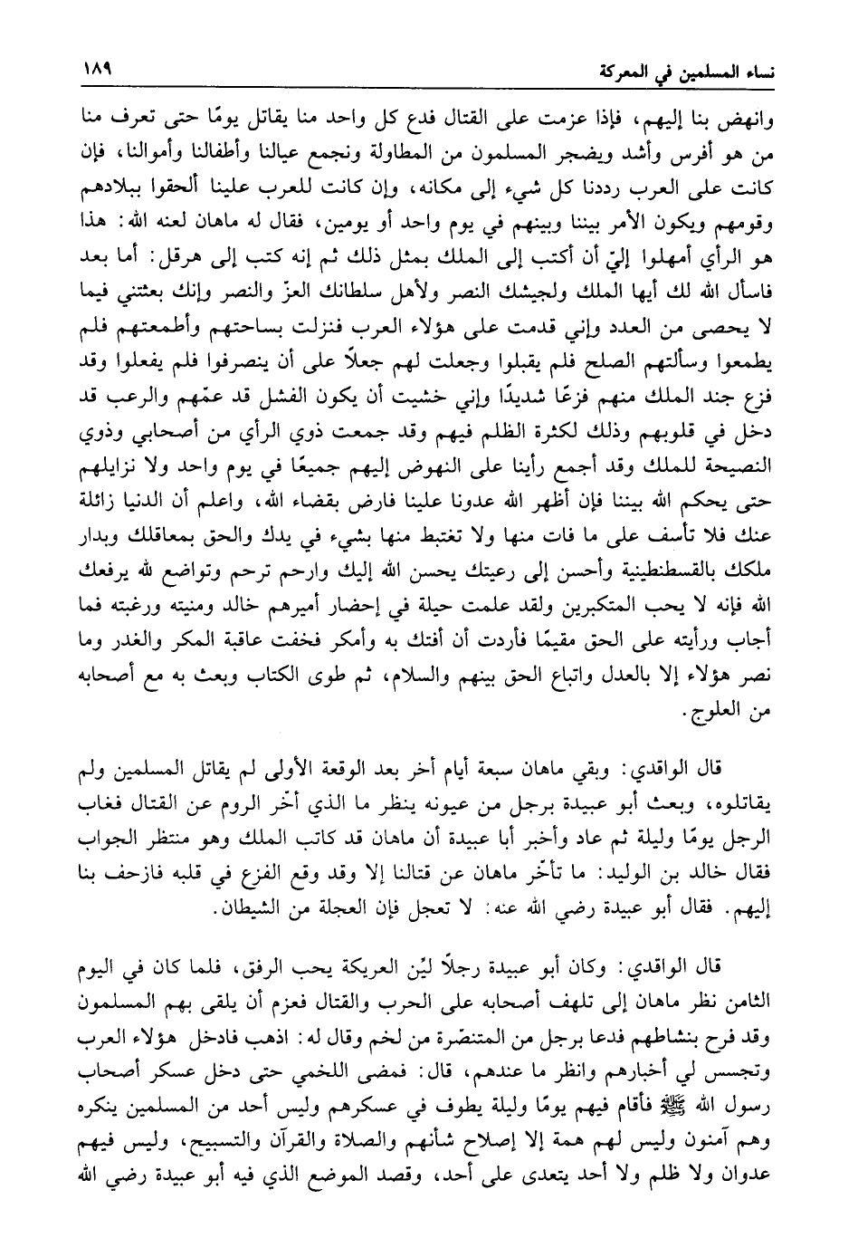 وانهض بنا إليهم فإذا عزمت على القتال فدع كل واحد منا يقاتل يوما حتى تعرف منا من هو أفرس وأشد ويضجر المسلمون من المطاولة ونجمع عيالنا وأطفالنا وأموالنا فإن كانت على العرب رددنا كل شيء إلى مكانه وأن كانت للعرب علينا الحقوا ببلادهم وقومهم ويكون الأمر بيننا وبينهم في يوم واحد أو يومين فقال له: ماهان لعنه الله هذا هو الرأي أمهلوا إلى أن أكتب إلى الملك بمثل ذلك ثم إنه كتب إلى هرقل أما بعد فأسأل الله لك أيها الملك ولجيشك النصر ولاهل سلطانك العز والنصر وإنك بعثتني فيما لا يحصى من العدد وإني قدمت على هؤلاء العرب فنزلت بساحتهم وأطمعتهم فلم يطمعوا وسألتهم الصلح فلم يقبلوا وجعلت لهم جعلا على أن ينصرفوا فلم يفعلوا وقد فزع جند الملك منهم فزعا شديدا وإني خشيت أن يكون الفشل قد عمهم والرعب قد دخل في قلوبهم وذلك لكثرة الظلم فيهم وقد جمعت ذوي الرأي من أصحابي وذوي النصيحة للملك وقد أجمع رأينا على النهوض إليهم جميعا في يوم واحد ولا نزايلهم حتى يحكم الله بيننا فإن اظهر الله عدونا علينا فارض بقضاء الله واعلم أن الدنيا زائلة عنك فلا تأسف على ما فات منها ولا تغتبط منها بشيء في يدك والحق بمعاقلك وبدار ملكك بالقسطنطينية وأحسن إلى رعيتك يحسن الله إليك وارحم ترحم وتواضع لله يرفعك الله فإنه لا يحب المتكبرين ولقد عملت حيلة في احضار أميرهم خالد ومنيته ورغبته فما أجاب ورأيته على الحق مقيما فأردت أن أفتك به وأمكر فخفت عاقبة المكر والغدر وما نصر هؤلاء إلا بالعدل واتباع الحق بينهم والسلام ثم طوى الكتاب وبعث به مع أصحابه من العلوج.