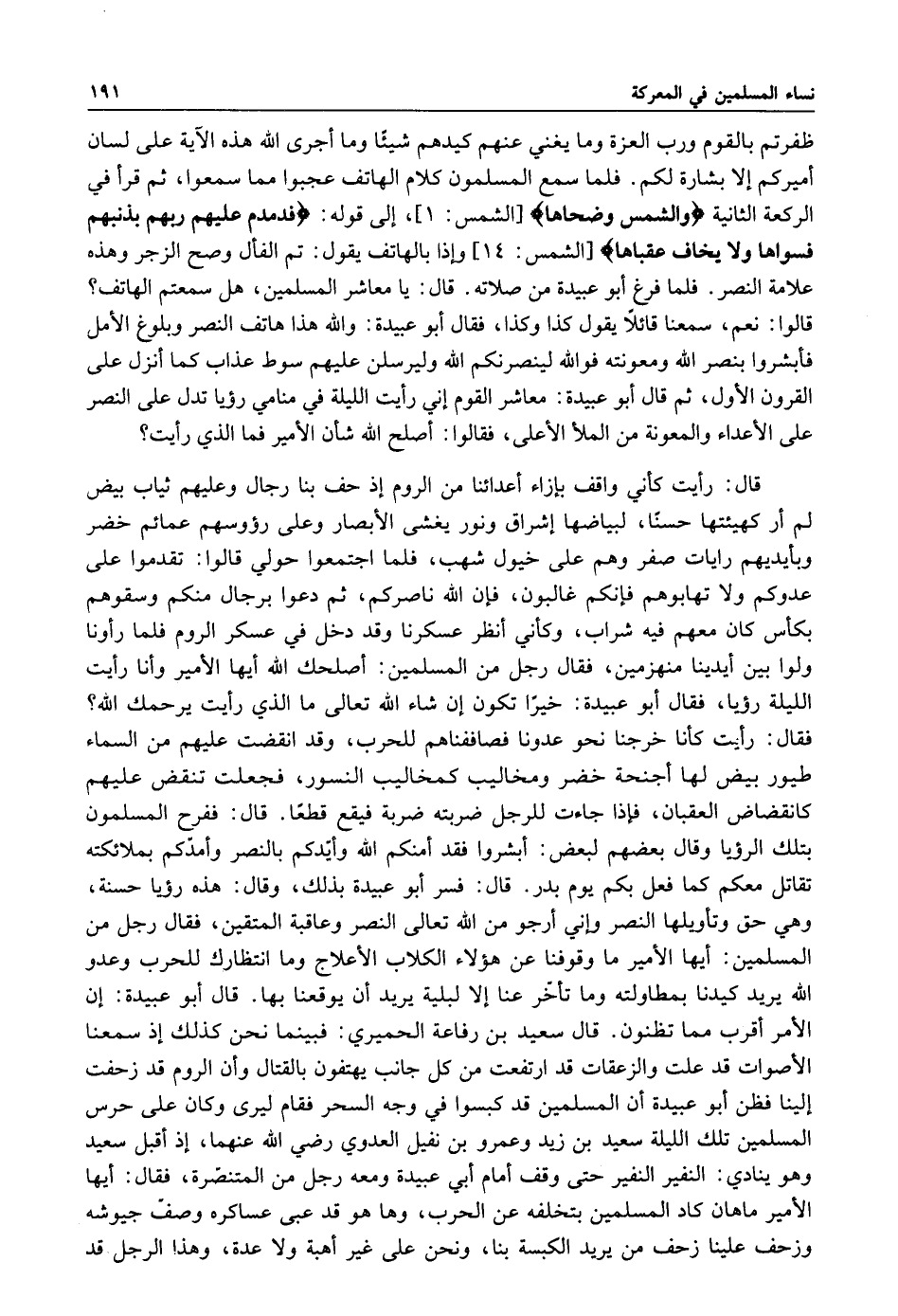 ظفرتم بالقوم ورب العزة وما يغني عنهم كيدهم شيئا وما أجرى الله هذه الآية على لسان أميركم إلا بشارة لكم فلما سمع المسلمون كلام الهاتف عجبوا مما سمعوا ثم قرأ في الركعة الثانية: {وَالشَّمْسِ وَضُحَاهَا} [الشمس:1] إلى قوله: {فَدَمْدَمَ عَلَيْهِمْ رَبُّهُمْ بِذَنْبِهِمْ فَسَوَّاهَا*وَلا يَخَافُ عُقْبَاهَا} [الشمس: 14] وإذا بالهاتف يقول: تم الفال وصح الزجر وهذه علامة النصر فلما فرغ أبو عبيدة من صلاته قال: يا معاشر المسلمين هل سمعتم الهاتف قالوا: نعم سمعنا قائلا يقول: كذا وكذا فقال أبو عبيدة: والله هذا هاتف النصر وبلوغ الأمل فابشروا بنصر الله ومعونته فوالله لينصرنكم الله وليرسلن عليهم سوط عذاب كما أنزل على القرون الأول ثم قال أبو عبيدة: معاشر القوم إني رأيت الليلة في منامي رؤيا تدل على النصر على الأعداء والمعونة من الملأ الأعلى فقالوا: أصلح الله شأن الأمير فما الذي رأيت.